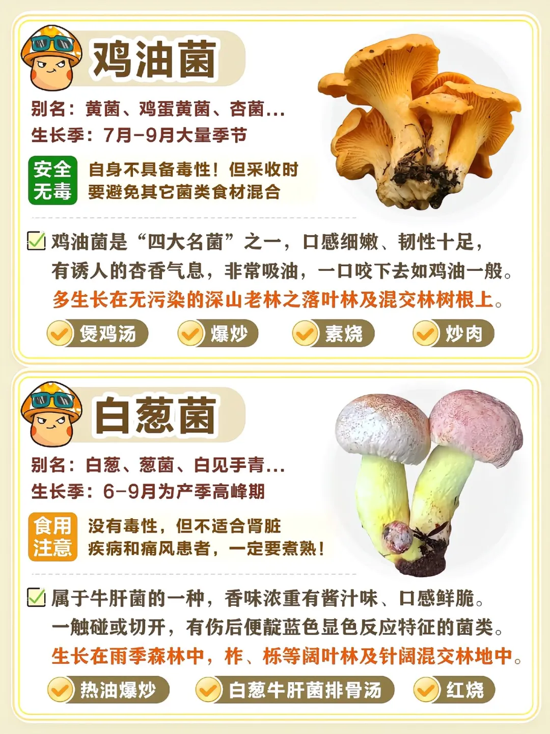 ✅鸡油菌:7 - 9月大量有,“四大名菌” 之一!杏香气息诱人,吸油又嫩滑,煲汤、爆炒都绝,一口鸡油感谁懂!
