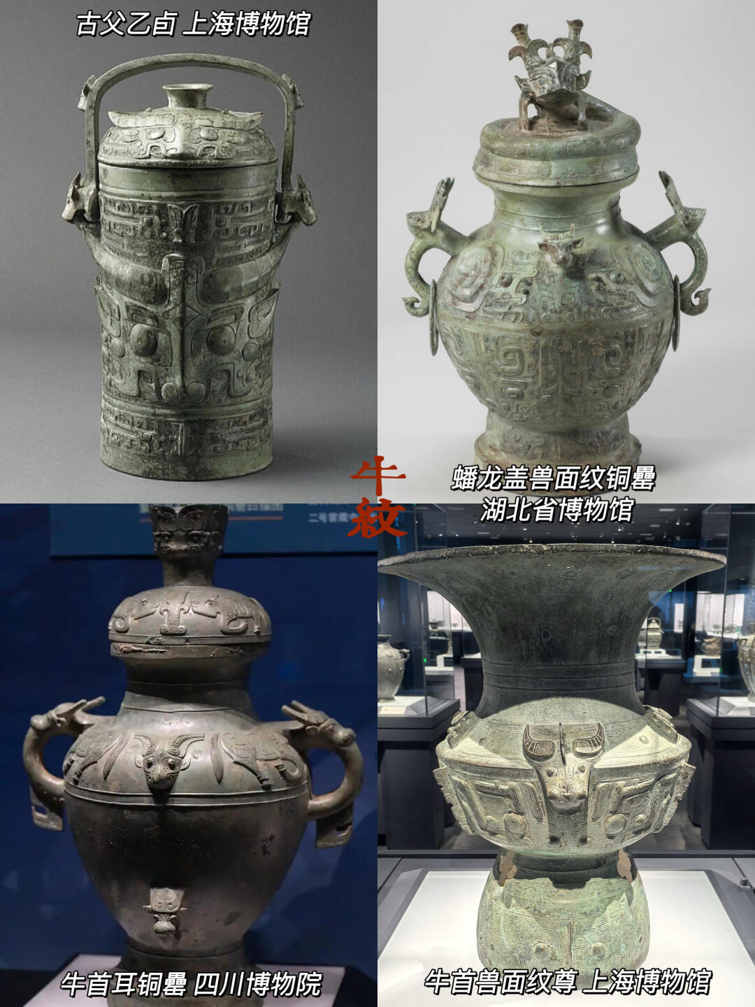 🔸而在青铜器中,牛首纹被装饰在鼎、簋、尊、罍等大型青铜器物上,以正面示人。作为商代祭祀的大牲之一,它常被认为是人与神的沟通媒介,享有显赫身份的人才可使用。