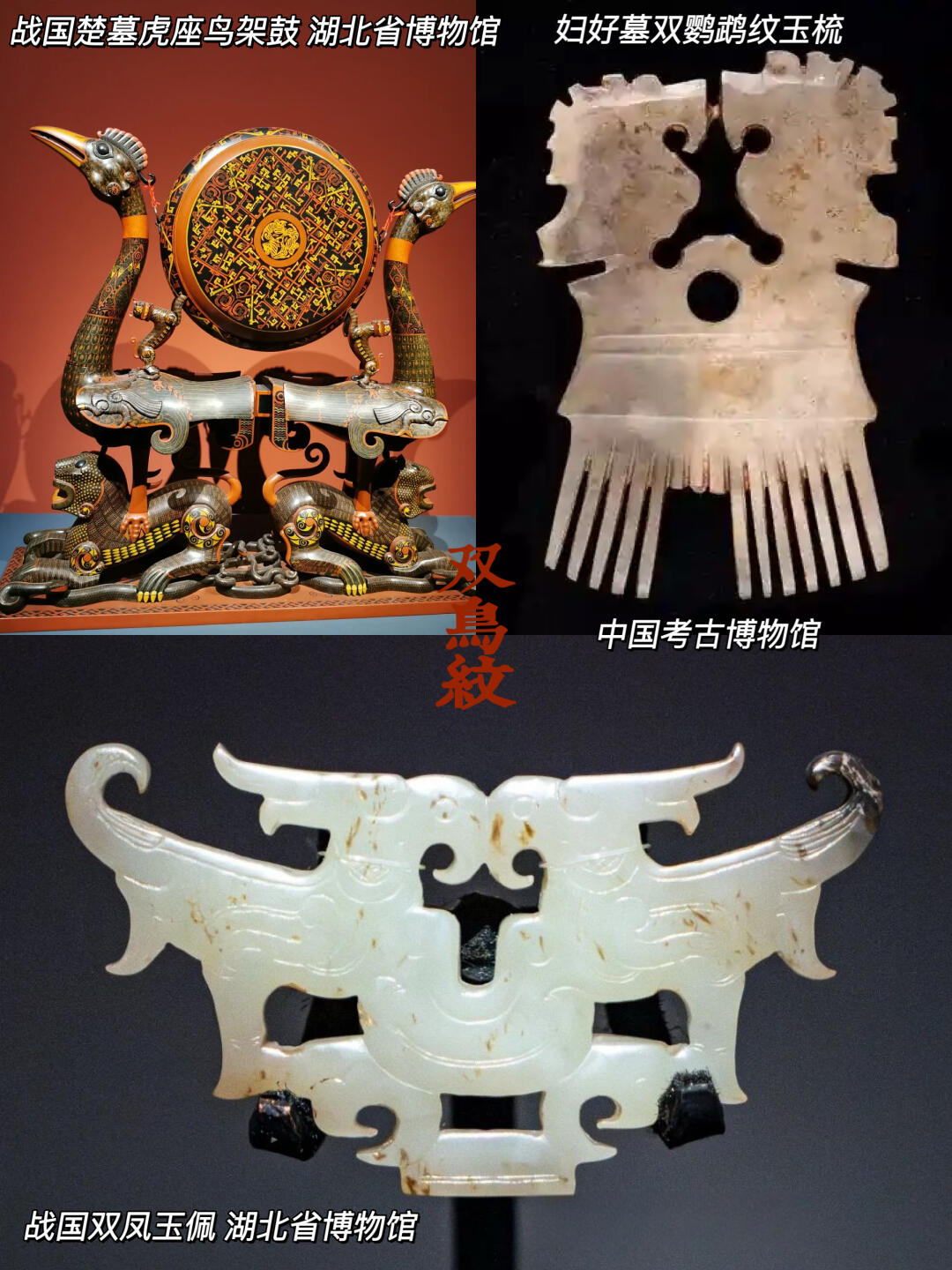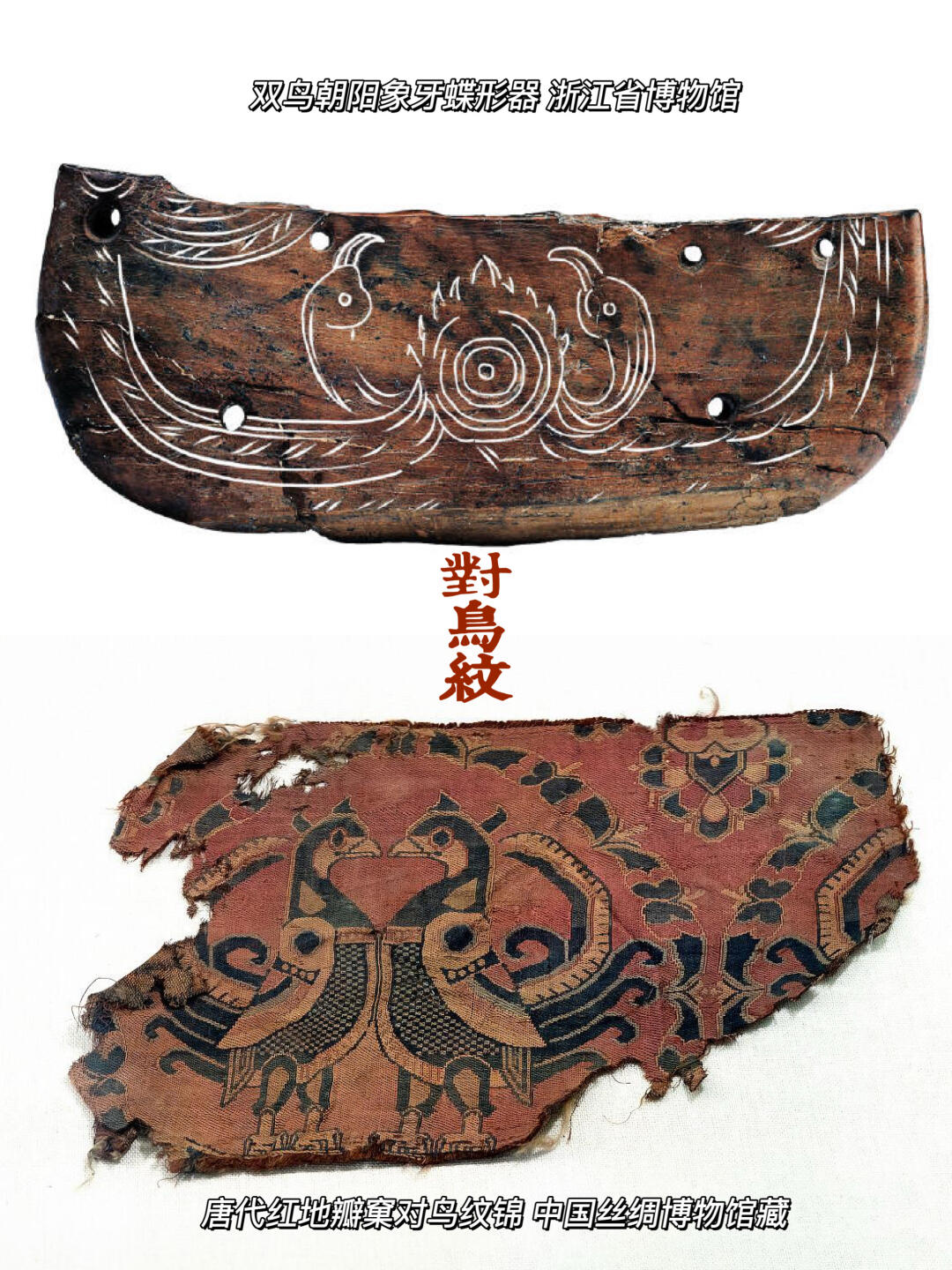 “对鸟”主题贯穿了整个历史,它们初看似兽,实则双喙相连呈面对面状,在河姆渡文化的象牙上、楚国的玉雕、漆木鼓架上、汉代的石画像以及唐代的织锦图案里,都能看到它们的身影。