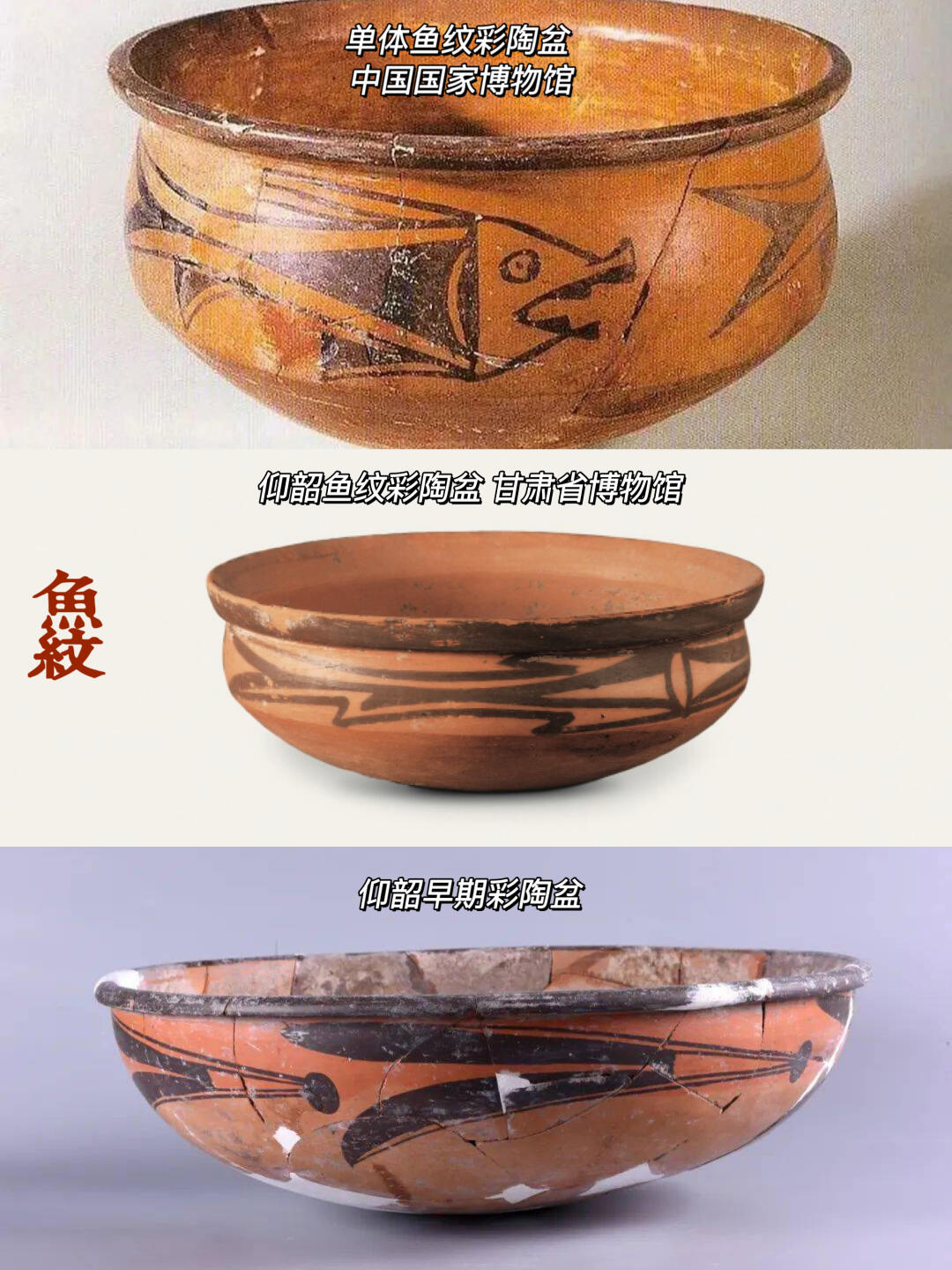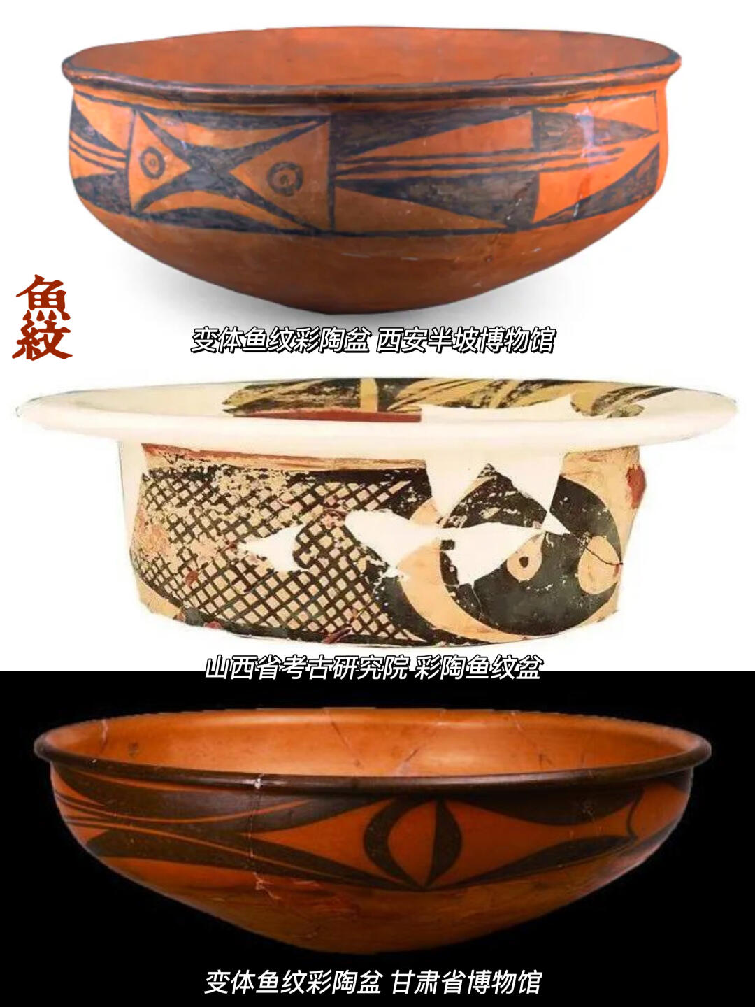🔸接下来说象征丰收的鱼纹,它常见于仰韶文化和庙底沟文化彩陶中,有具象的,也有抽象到圆点代替鱼头,省略鱼身,双箭形代替鱼尾的。