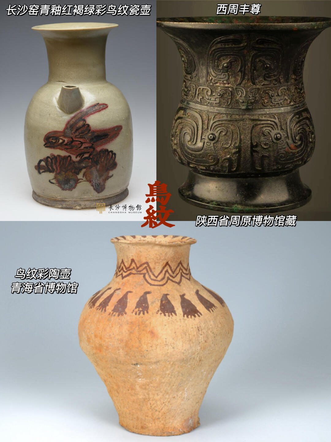鸟纹自良渚文化时期便有出现,一直延续到青铜纹饰、陶瓷纹饰等等,而最初关于它的想象也许与太阳相关,人们认为太阳的东升西落就是靠着鸟来运送的。