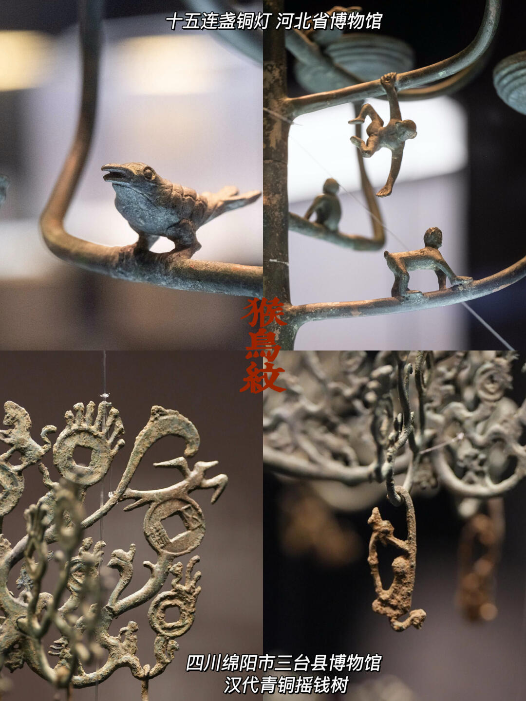 🔸猴与鸟的搭配也很普遍,中山王墓的十五连枝灯、汉代摇钱树上,两个动物都有出现,它们代表了什么呢?