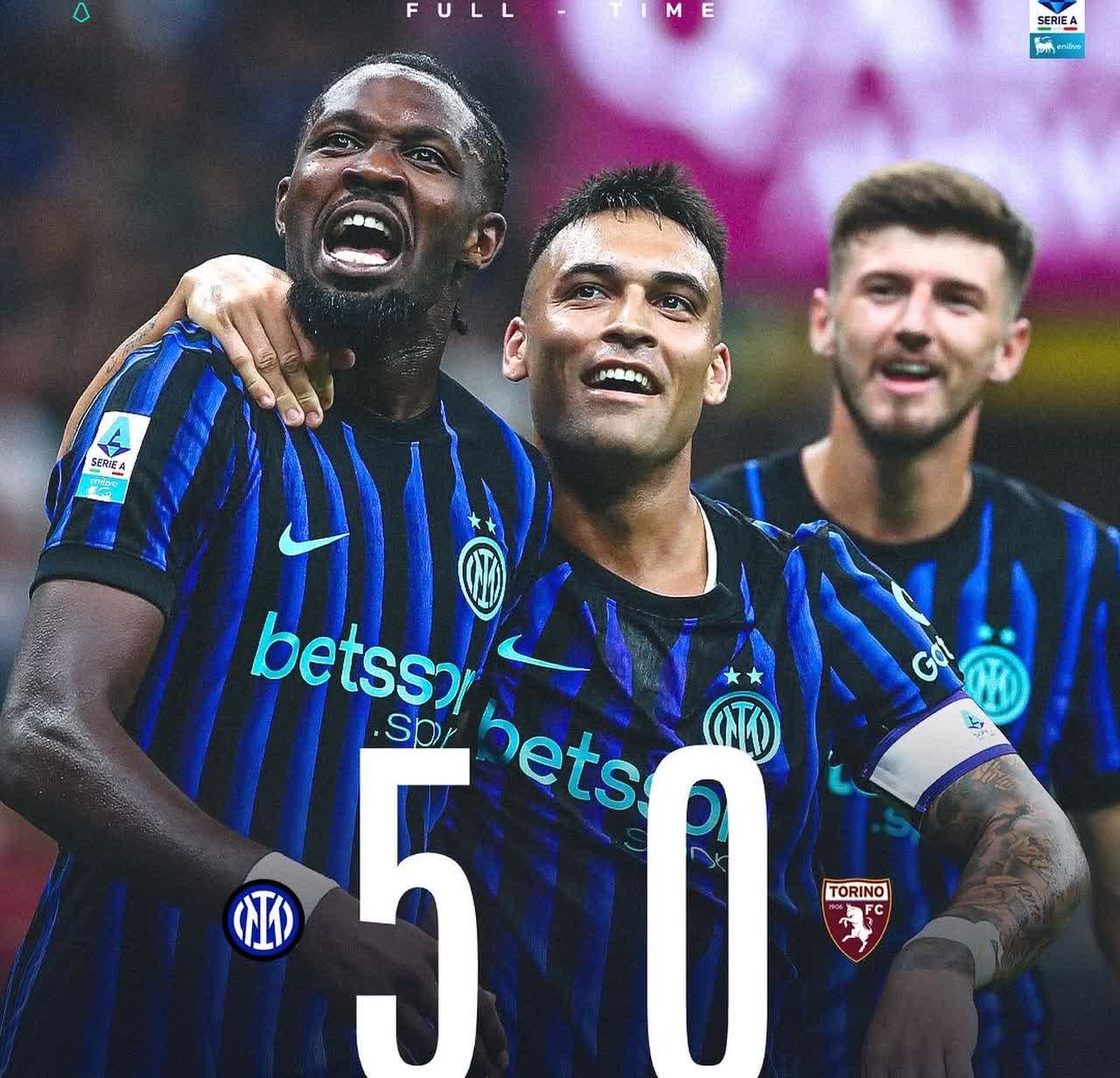不能要求齐沃更多! 意甲第一轮:国际米兰5:0都灵 赛前如果说5:0的比分,大部分人肯定都不太相信,但是真实的发生了!不能要求齐沃更多了! ⚽️巴斯托尼🅰️巴雷拉18” ⚽️图拉姆🅰️苏西奇36” ⚽️劳塔罗52” ⚽️图拉姆🅰️巴斯托尼62” ⚽️博尼🅰️劳塔罗 图拉姆看似放松的状态,拿到2球独占射手榜首位,劳塔罗和巴斯托尼一传一射,博尼代表国际米兰首秀进球值回转会费,苏西奇意甲首秀贡献助攻,更重要的是可以平替姆希塔良完成年轻化,巴雷拉是最低调的那一个贡献助攻!还有新援亮相,苏西奇首发,博尼,迪乌夫,亨里克替补登场,很不错,下一场希望皮奥·埃斯波西托登场亮相! 刘腾解说的时候还盘点了一下国际米兰的不足分享给大家:新援磨合(迪乌夫失误),新阵型3421不成熟,后腰位置厚度不足。随着赛季的深入,逐渐去解决吧! 都灵队三名前国际米兰球员,比拉吉,拉扎罗,卡萨代,在巴罗尼的433阵容中无法发挥,没有给国际米兰造成太大麻烦!