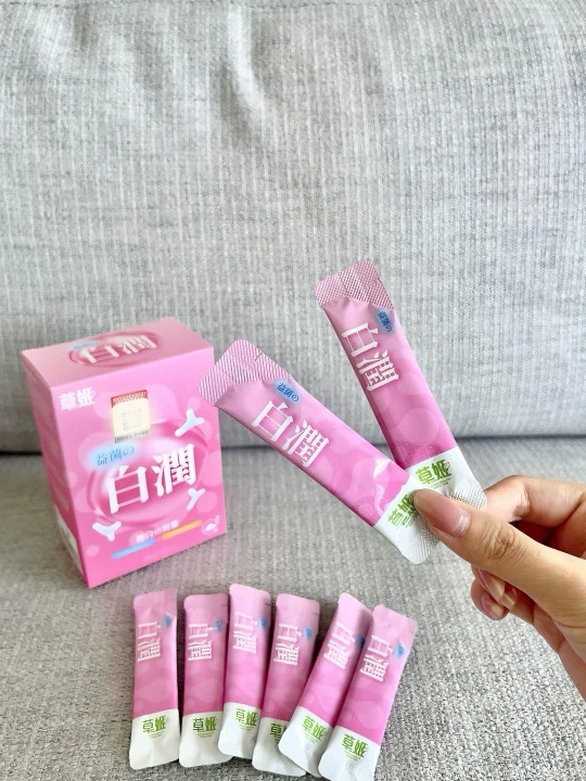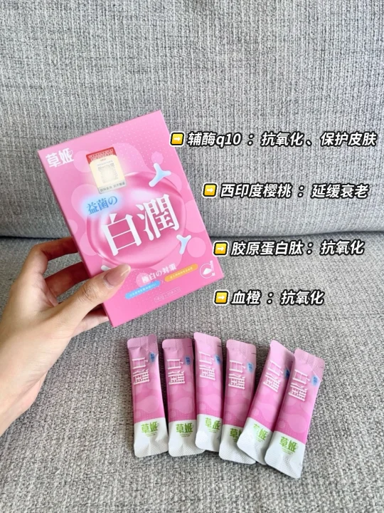 里面是有益生菌成份的,水蜜桃味的很好吃,可以冲水或者直接口服,独立包装携带也很方便~这种内服可以坚持一直吃,放在办公室也很方便,把奶茶换成它,真的很健康~