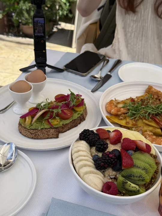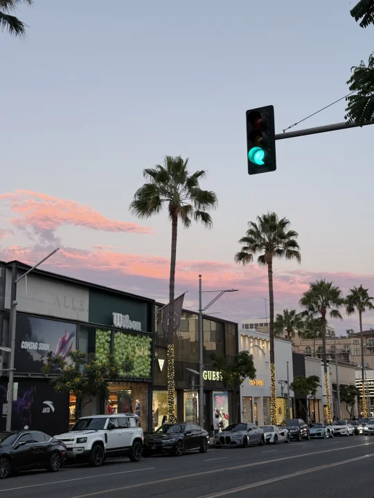 花园喷泉旁的位置需要提前预约!!! Avocado toast有点踩雷,面和acai bowl都很好吃很好吃! 当然咱们主要是为了拍照来的,光线很棒,背景很雅,狠狠出片了!服务费硬性20%,所以在此基础上没给小费了[石化R] 进城的感受:比弗利的夕阳比dt粉一些