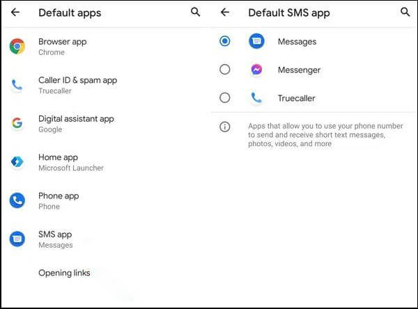 对于Android 10 及以上版本,请将“短信备份与恢复”设置为默认短信应用(设置 > 应用 > 默认应用 > 短信应用)。这有助于解决访问短信数据的权限限制问题。恢复完成后,您可以改回您常用的短信应用。