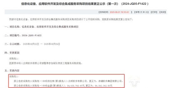 然而,8月21日,某单位采购网突然发布了项目结果更正公示(第一次),北明软件的预中标资格被废,是出了什么事?