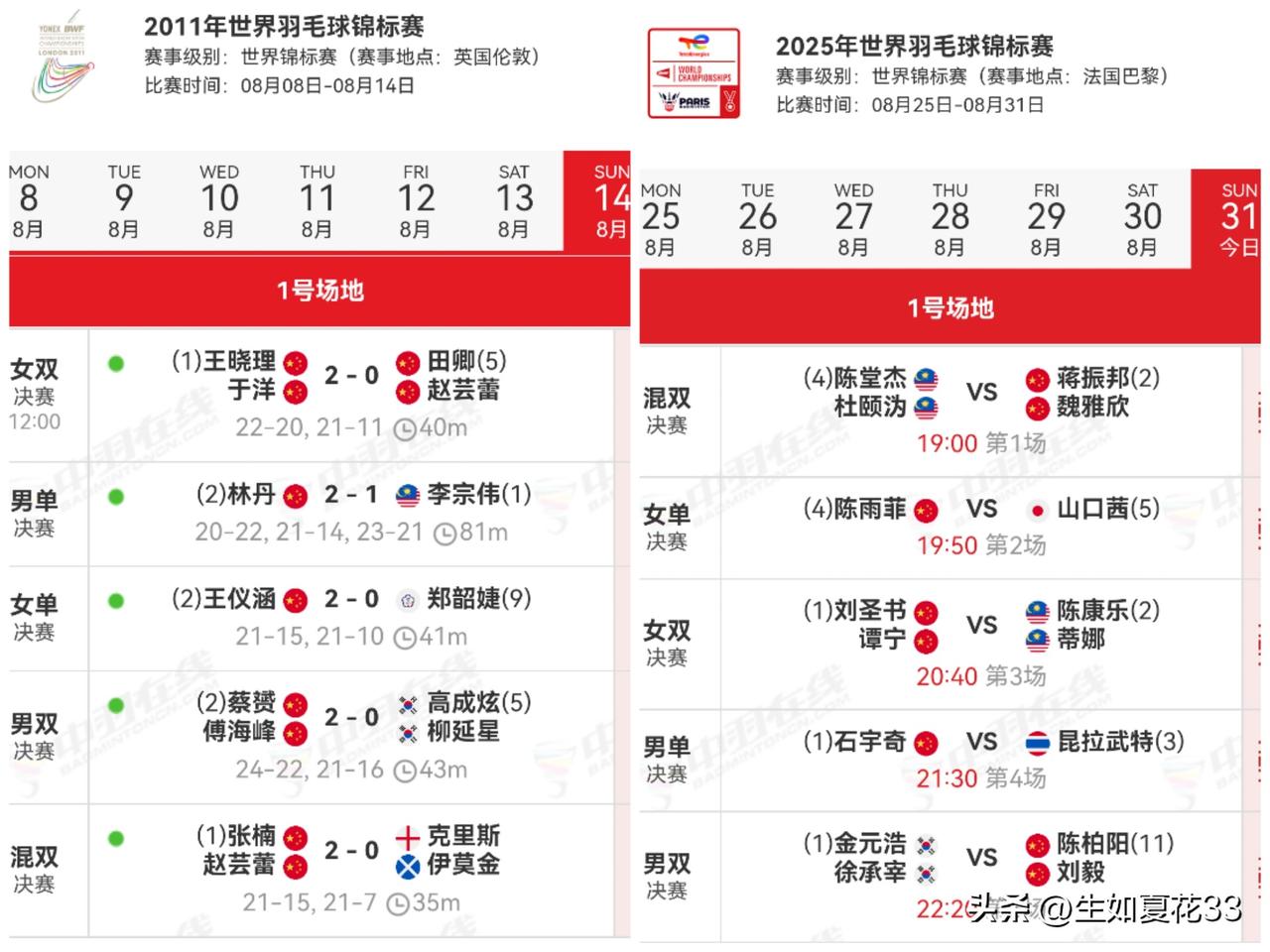 2011-2014年期间,共举行10次世界羽毛球锦标赛。国羽冠军情况如下:男单,林丹、谌龙各取得两次冠军,女单只有王仪涵一人次在2011年夺冠,我们期待着陈雨菲破国羽世锦赛女单的冠军荒,男双取得3次冠军,女双成绩亮眼有8次,其中凡尘4次,混双也不赖,6次冠军,其中郑思维黄雅琼3次,张楠/赵芸蕾3次。 在这段时间内,国羽取得最好的成绩在2011年,当时取得5金1银的优异成绩。时隔14年,2025年世锦赛,国羽再次5个单项全部晋级决赛,能否再创辉煌,我们期待着!!!2025年世界羽毛球锦标赛 石宇奇