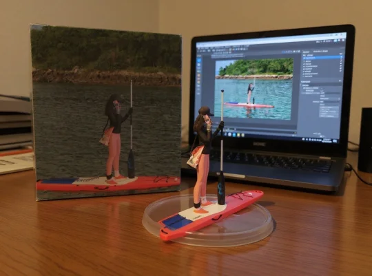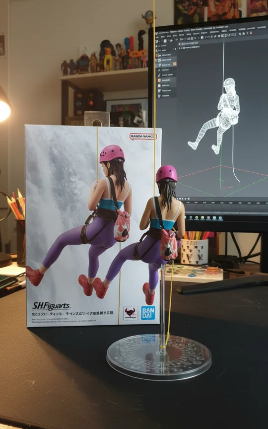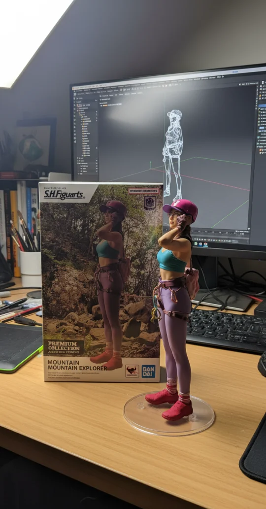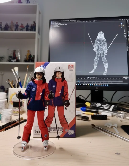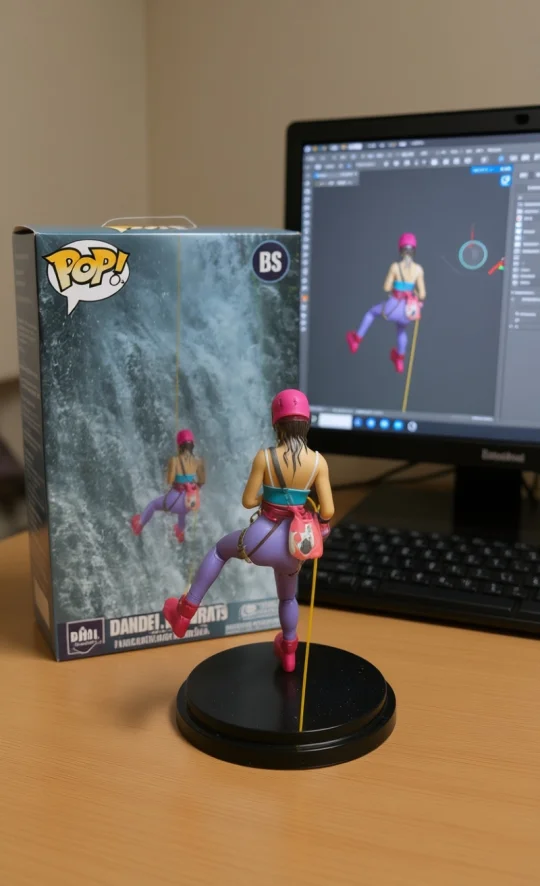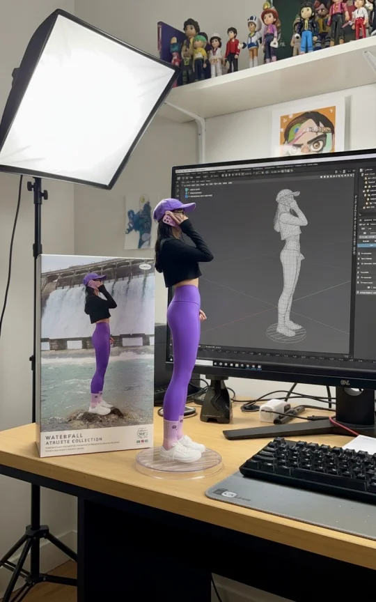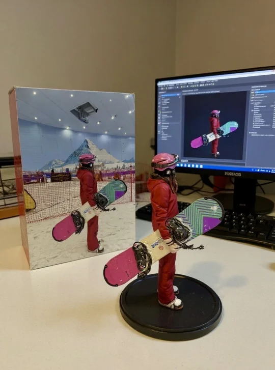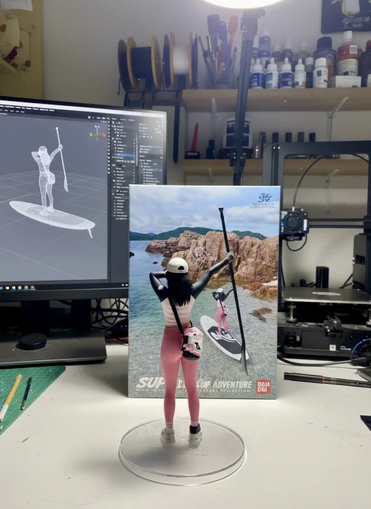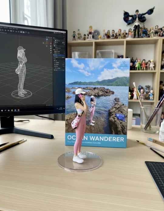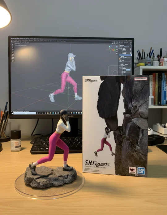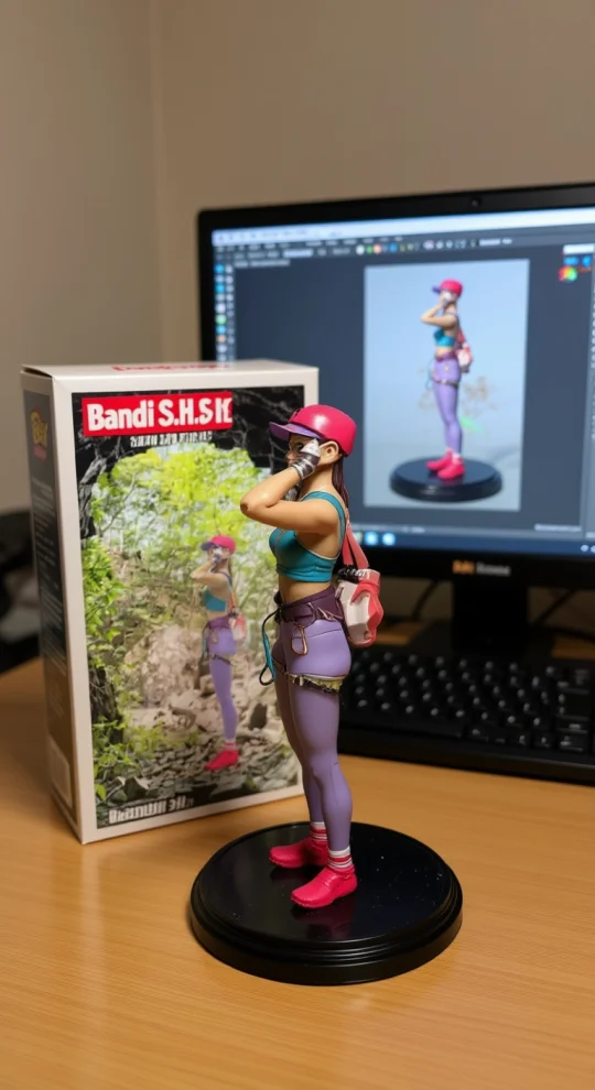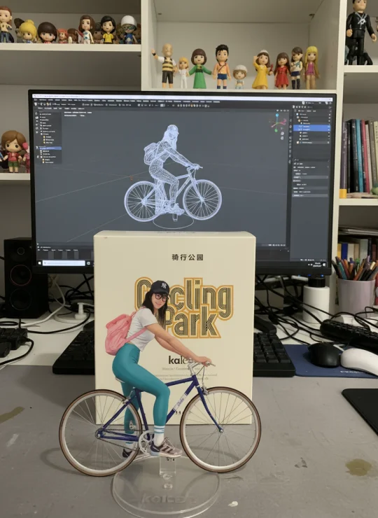 without any text.On the computer screen, display the ZBrush modeling process of the figure.Next to the computer screen, place a TAMIYA-style toy packaging box printedwith the original artwork.