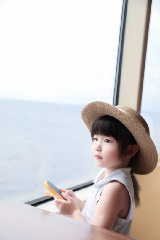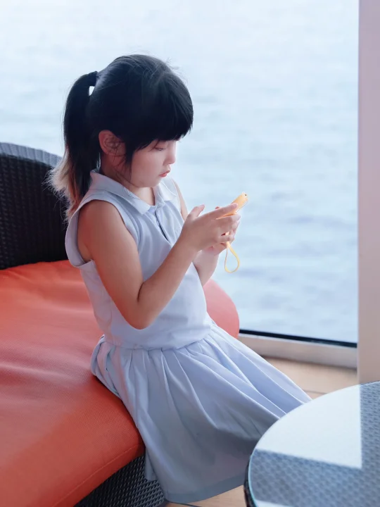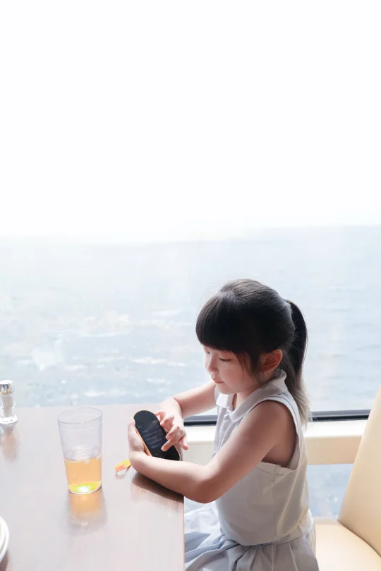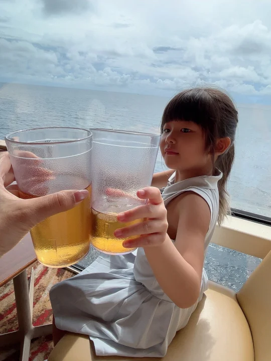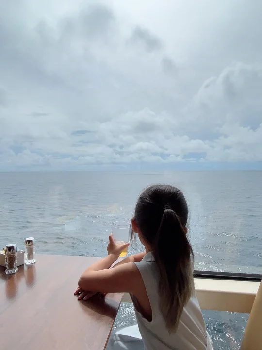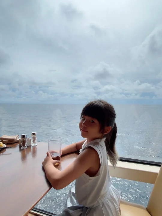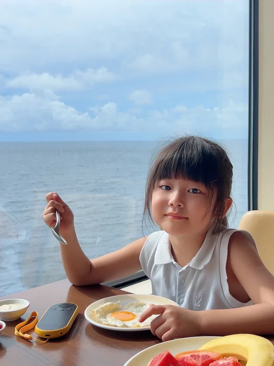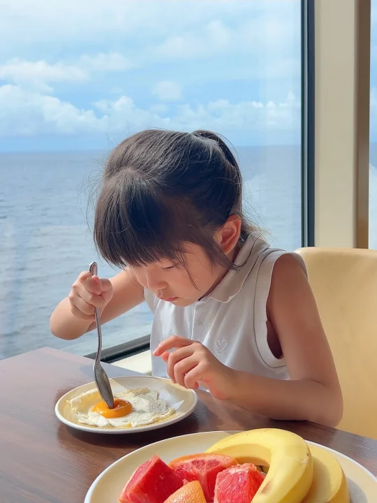 带娃坐游轮,最惊喜的就是在光谱号帆船餐厅窗边吃早餐!阳光洒进来,海面波光粼粼,小朋友吃得超开心,画面太美好啦📸