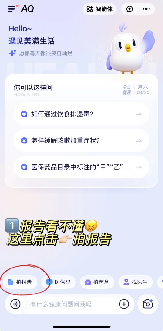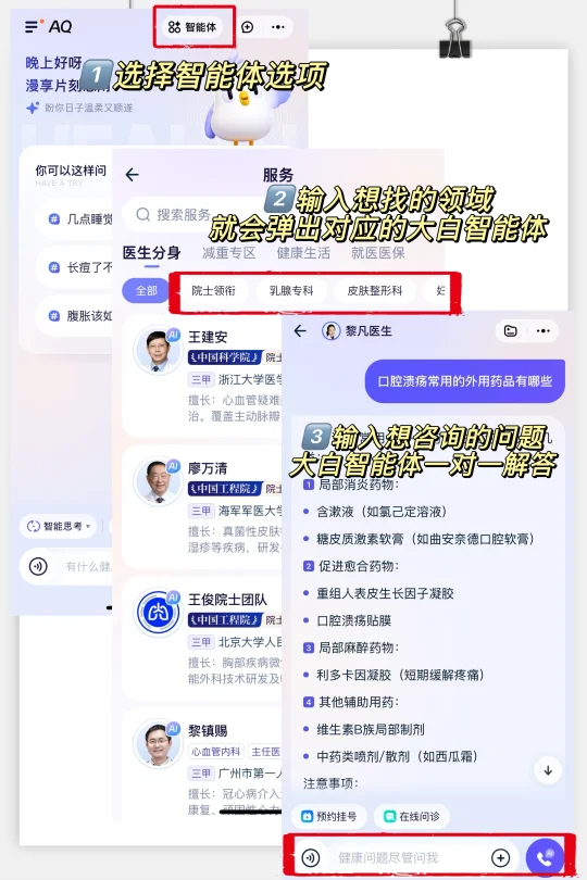AQ可以帮我记录每次溃🐑疡的周期和触发原因,提醒我“近段时间压力过大,注意休息”。偶尔疼得厉害,我就点开右上角【智能体】咨询相对应的大白智能体,快速明白是否用💊,省时省心不误事