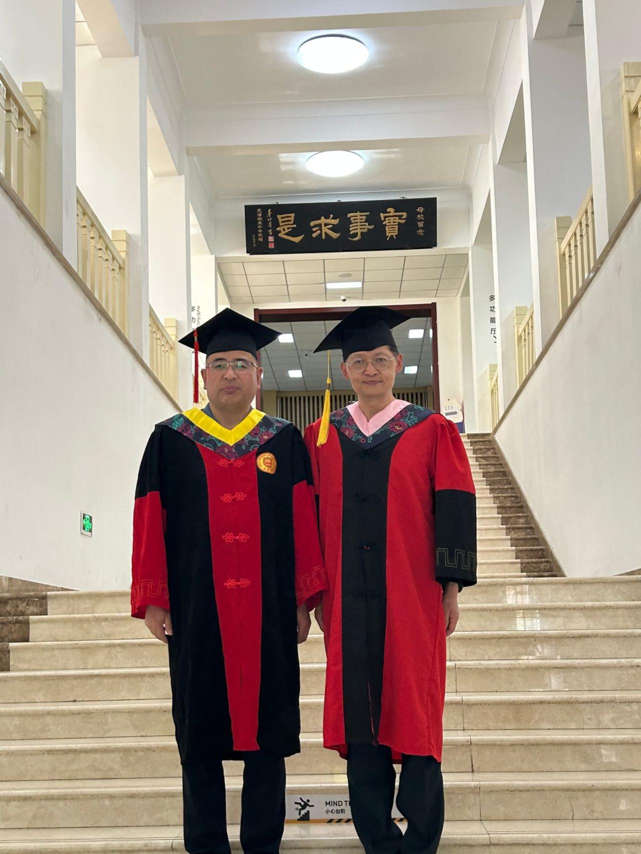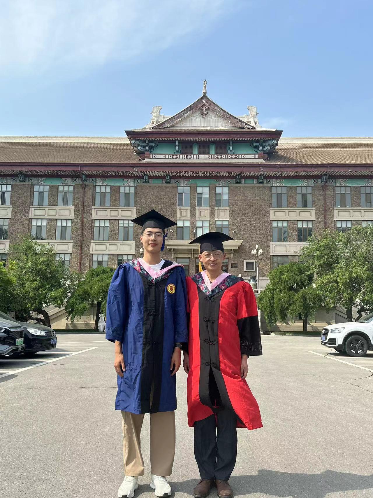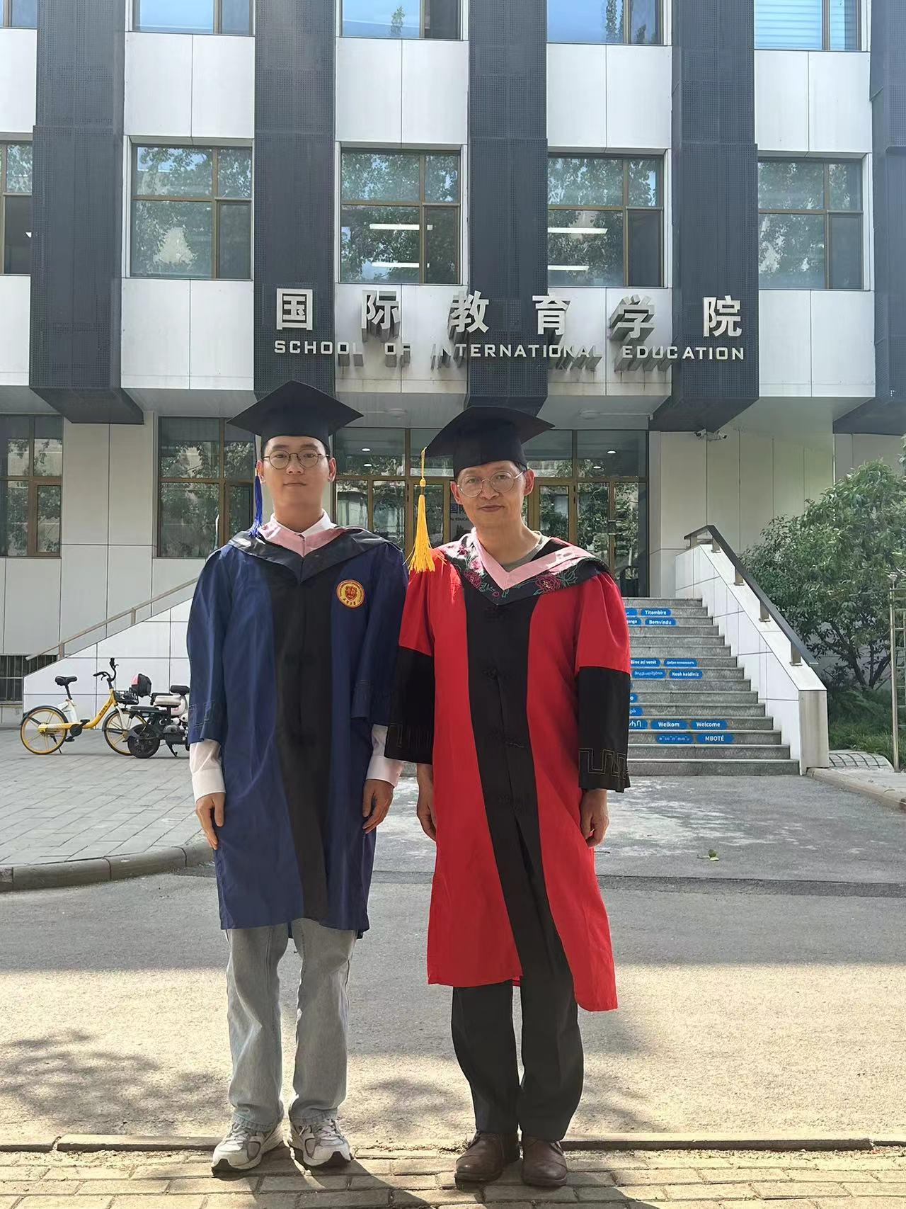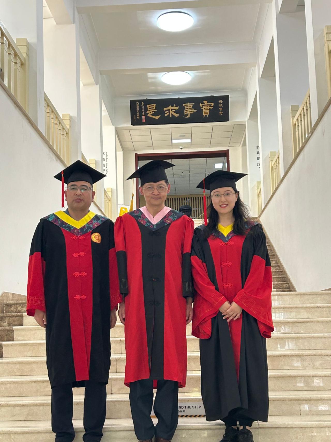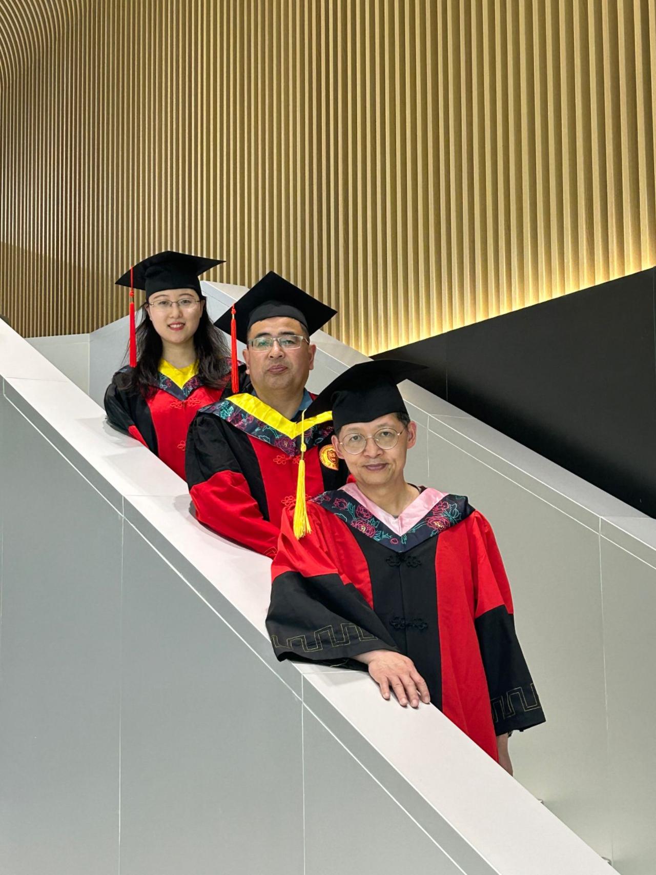 下午,太阳大,风大,和去年和今年毕业的博士生、硕士生们毕业留影。有几个考公的学生去最后办入职手续缺席,在场的同学们一起把仪式补齐。有同学突然发现一个神秘现象,目前毕业的三位工科博士他们每个人的名字取一个字就形成了我的名字。马延孝博士,刘智英博士、刘垚瑶博士。今年毕业的硕士一个去了浙江杭州,进高校,一个去回山东进入公务员队伍,一个继续读博,还有朝鲜的同学即将回国。大家都算圆满!假以时日都比老师强。[玫瑰][玫瑰][玫瑰][拥抱][拥抱][拥抱]毕业季学位服仪式感拉满
