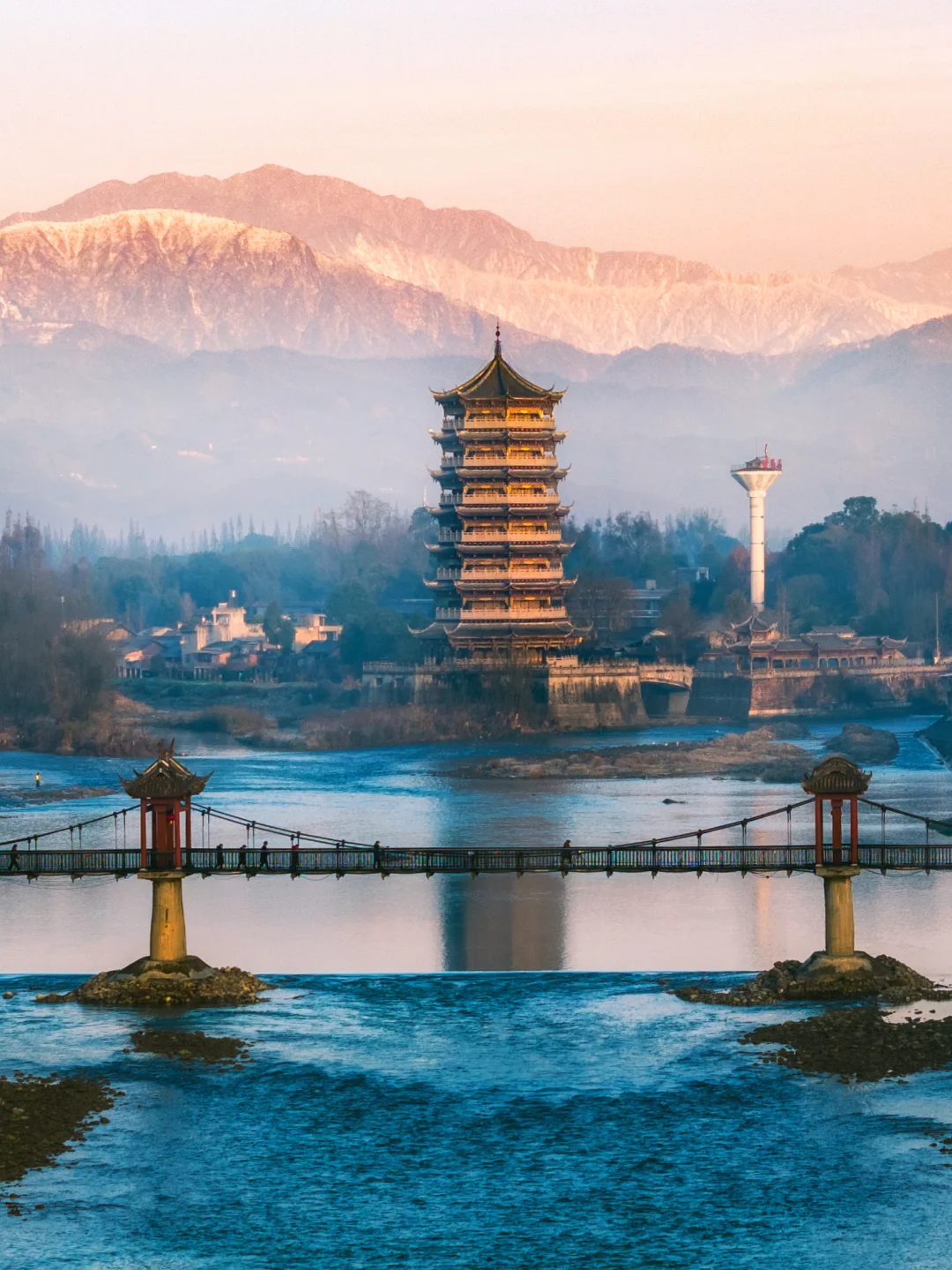 1️⃣汇江桥:横跨河流的吊桥,这里可以拍到古塔和雪山的合影