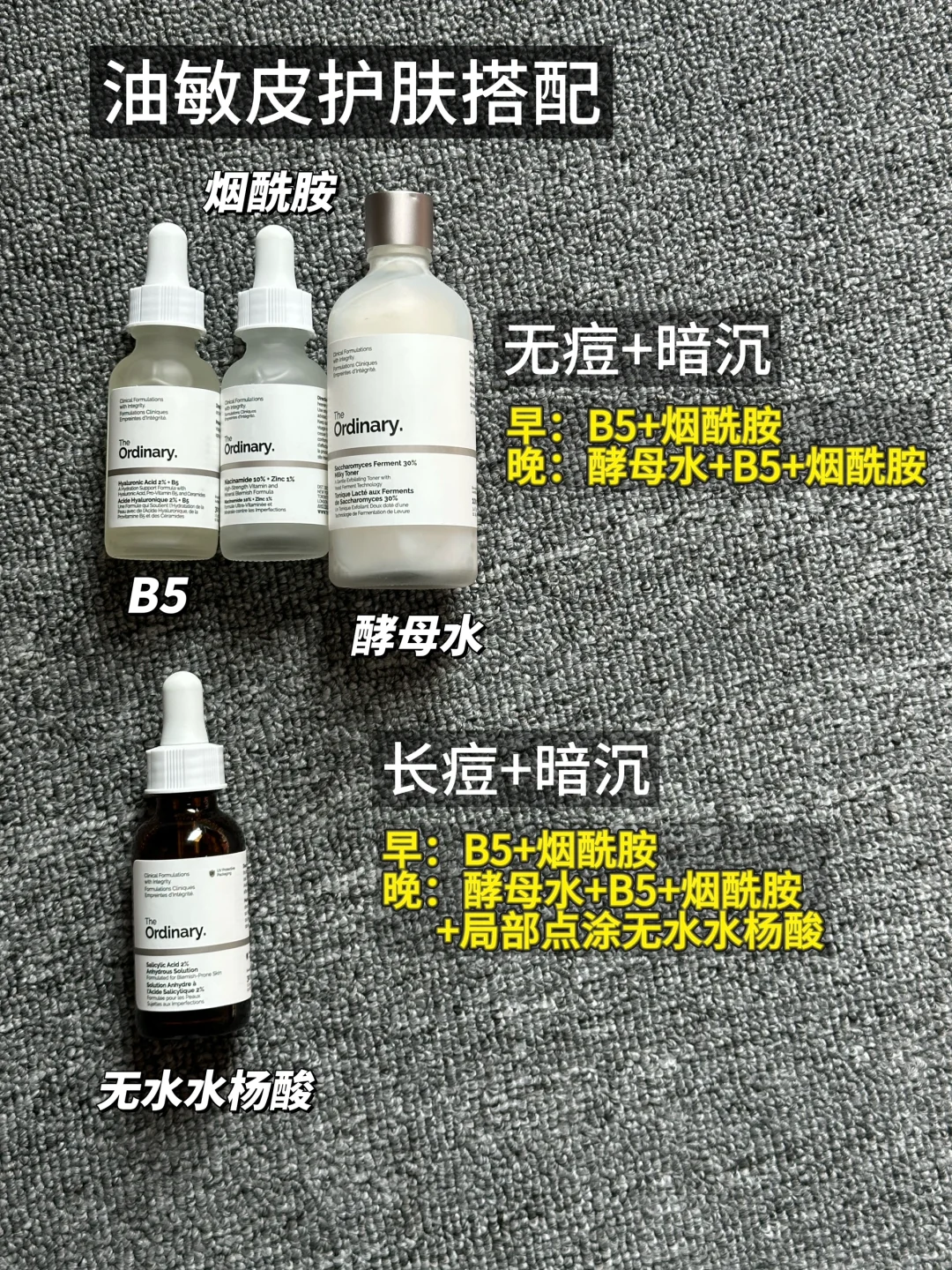 🌛晚:酵母水+B5+烟酰胺+点涂无水水杨酸