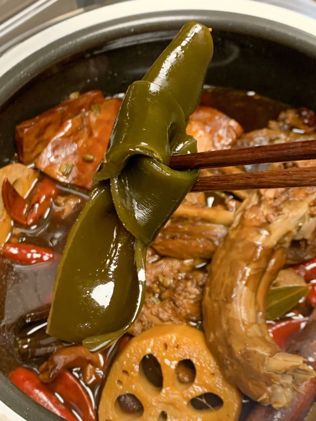 鸭脖、鸭掌、海带结、藕片、鸭翅、鸭胗(喜欢吃啥就放啥!)