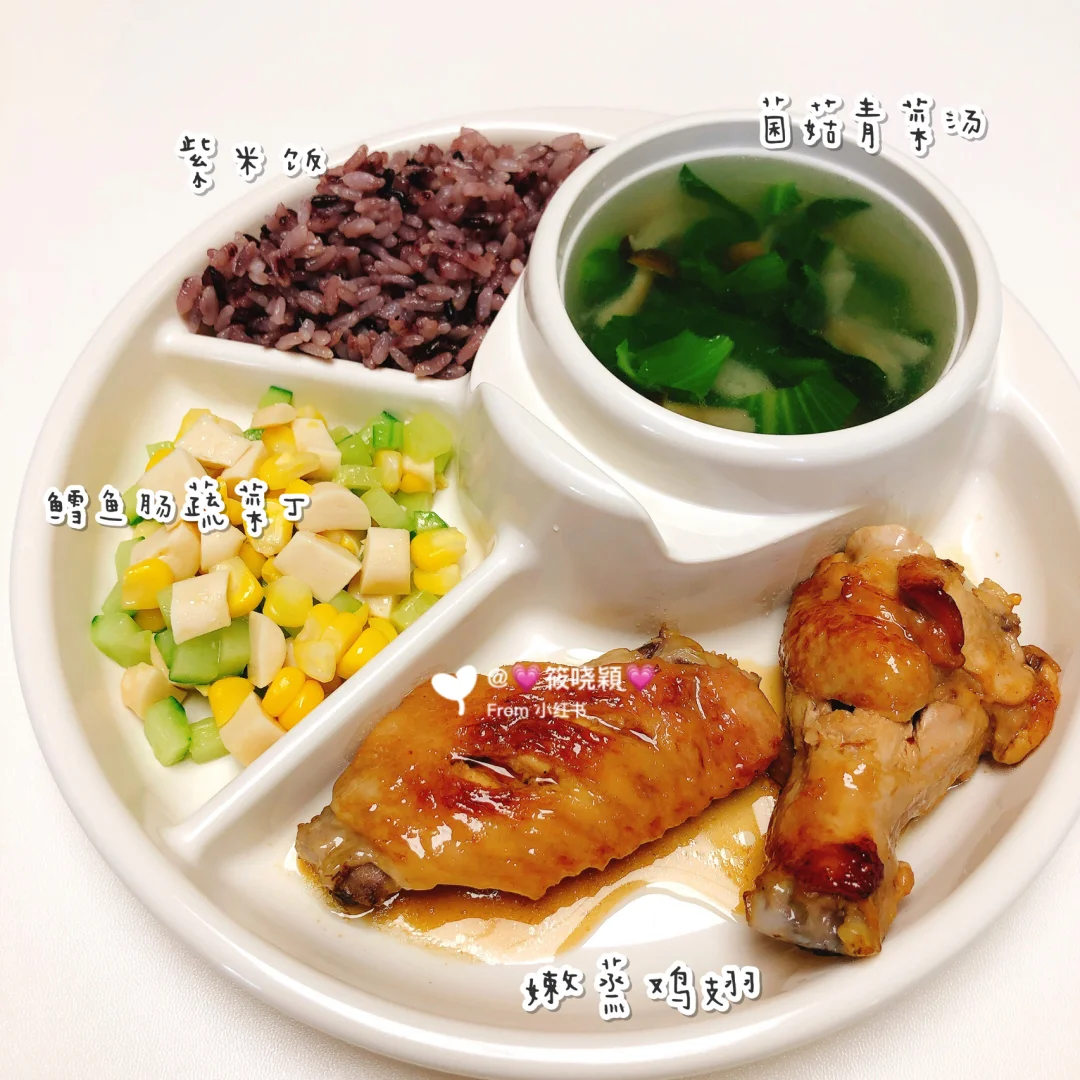 每个宝宝应该都爱鸡翅吧 不管鸡翅怎么做,我家一一都超爱😄 今天用蒸的,加点洋葱这样蒸出来的鸡翅很嫩很香,也不用担心宝宝会上火 做法在图片里,我今天用的一个鸡翅一个鸡翅根 2020.9.19/20M18D 🔸嫩蒸鸡翅 🔸鳕鱼肠蔬菜丁🥒🌽 🔸菌菇青菜汤🥬 🔸紫米饭🍚