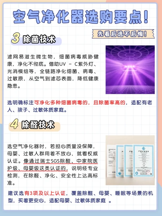 ⭐除菌技术:选明确标注可净化多种,且除菌率高的,适配有老人、孩子、过敏体质家庭。