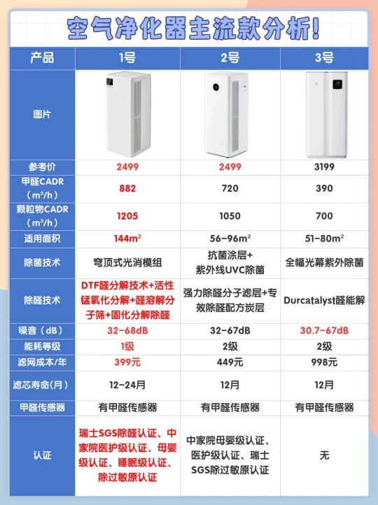 目前,3款优质空气净化器对比,在筛选过程中,我们不受品牌宣传的营销策略所影响,而是直接聚焦在空气净化器的核心性能数据上。这里我们展示了3款空气净化器的关键数据。这些数据均来源于官方渠道。