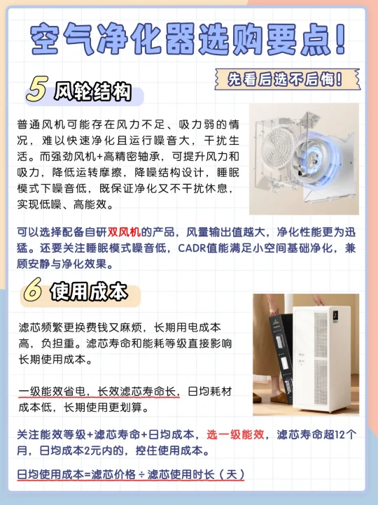 ⭐使用成本:关注能效等级 + 滤芯寿命 + 日均成本,选一级能效,滤芯寿命超 12 个月,日均成本≤2 元的,控住使用成本 。