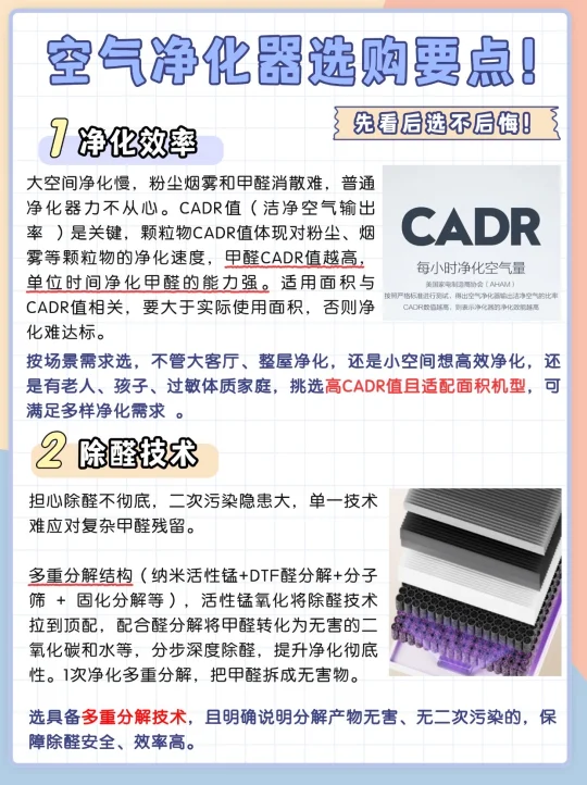 ⭐净化效率:按实际空间选,大客厅、整屋净化优先高 CADR、大适用面积机型,确保快速全面净化 。