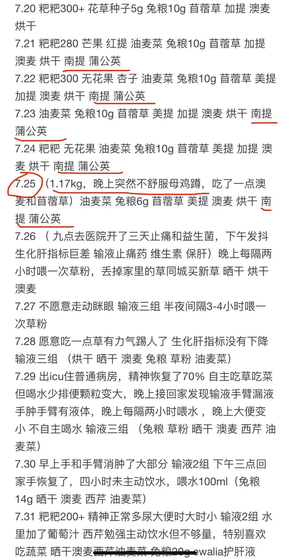 6.25号橙橙走后我接了只新兔子想陪伴莱莱,新兔子五个月大6.30-7.13期间就只喂了美提烘干苜蓿草,7.8号莱莱也走了,新兔子7.9号体检一切正常,7.14-7.25加入了南提和蒲公英,7.25晚上突然开始不吃喝母鸡蹲,第二天一早去医院拍片没有检查出问题开了点促消化的药就回家了,但下午不见好转开始发抖再次去医院,抽血生化肝指标高还发烧了,立马送进了icu下了病危,好在经过一周的治疗捡回了条命,在入院那天把家里的草全丢了同城买了新草。