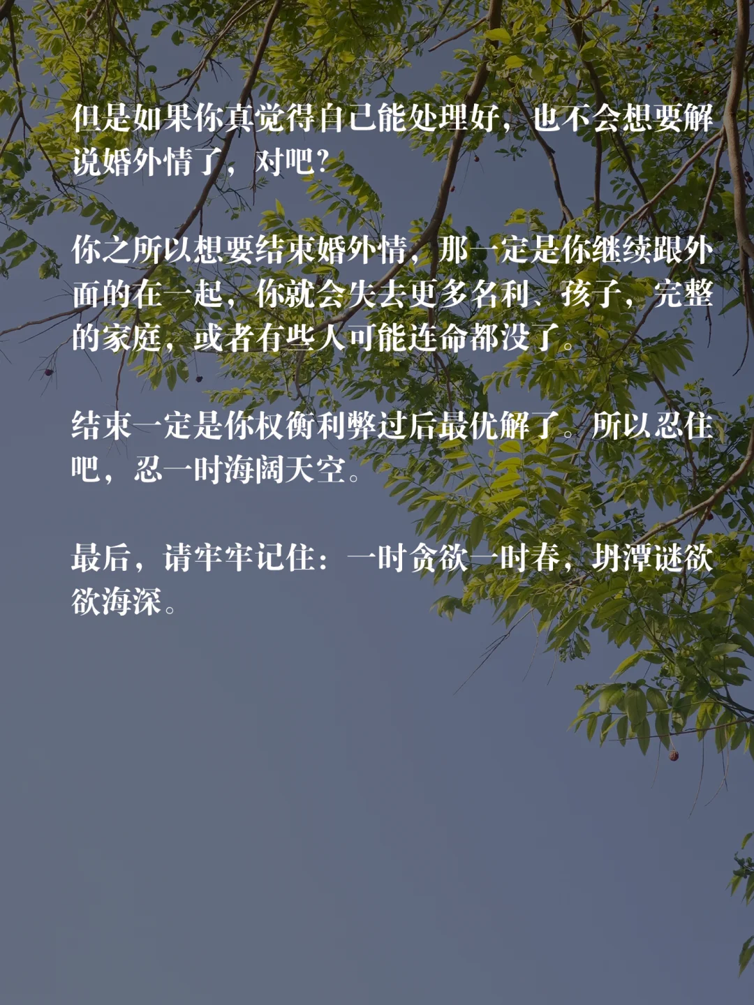 你之所以想要结束婚外情,那一定是你继续跟外面的在一起,你就会失去更多名利、孩子,完整的家庭,或者有些人可能连命都没了。