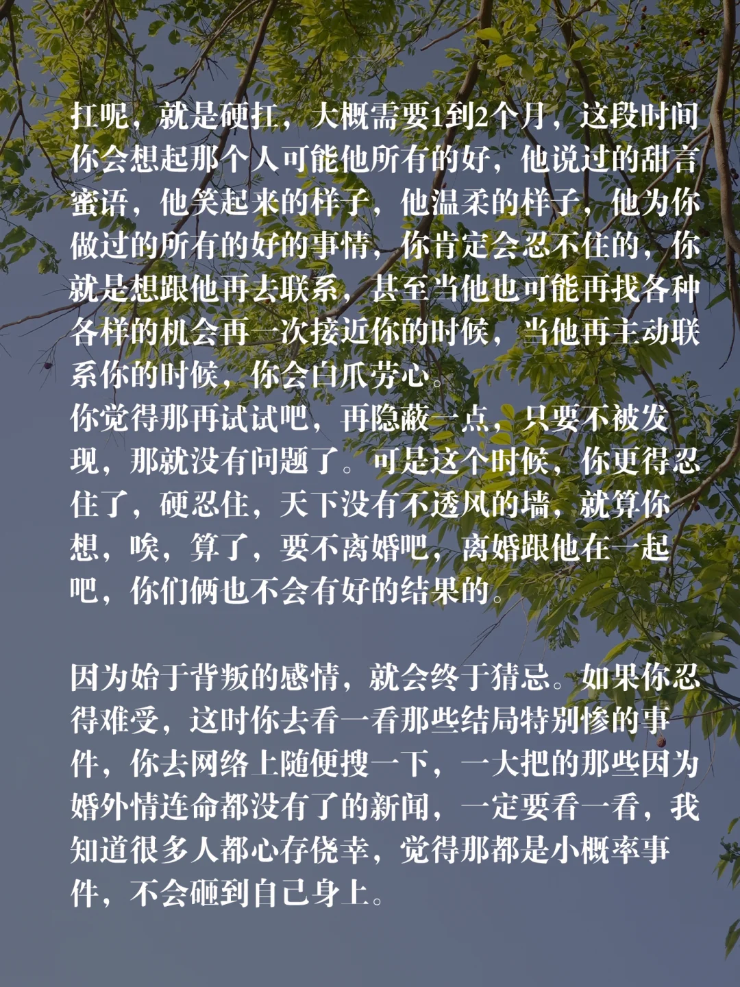因为始于背叛的感情,就会终于猜忌。如果你忍得难受,这时你去看一看那些结局特别惨的事件,你去网络上随便搜一下,一大把的那些因为婚外情连命都没有了的新闻,一定要看一看,我知道很多人都心存侥幸,觉得那都是小概率事件,不会砸到自己身上。