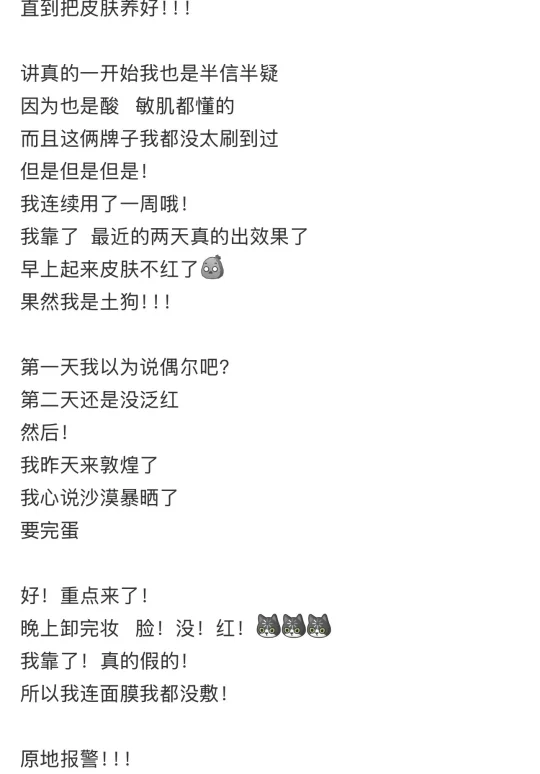 最近收到很多姐妹的反馈,白白我真的超级开心,好多姐妹说我推荐的搭配有用又见效快“一周就白了连带痘印消了”、“困扰很久的闭口没了”、“敏感肌用个一周皮肤就不泛红敏感了,现在敦煌暴晒一天卸妆后都不红”等等[完啦R]