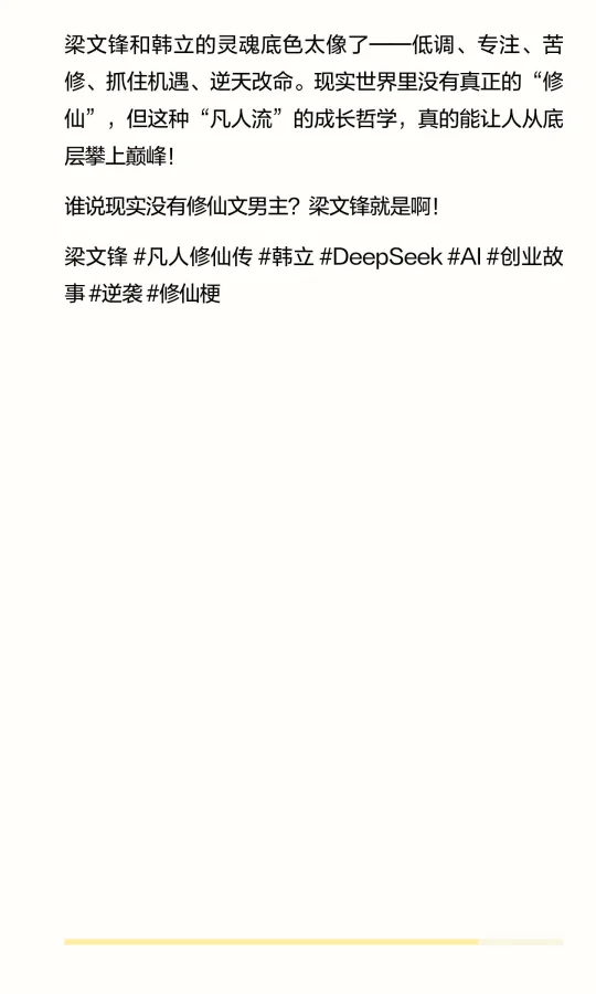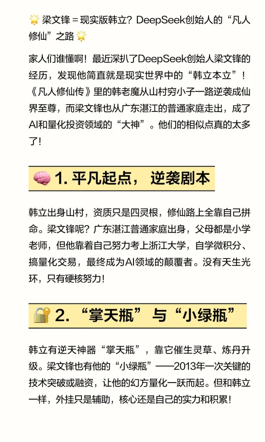 梁文锋 凡人修仙传 韩立 DeepSeek AI 创业故事 逆袭 修仙梗 梁文锋
