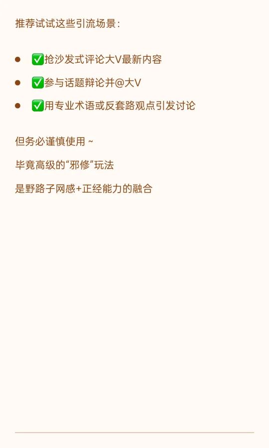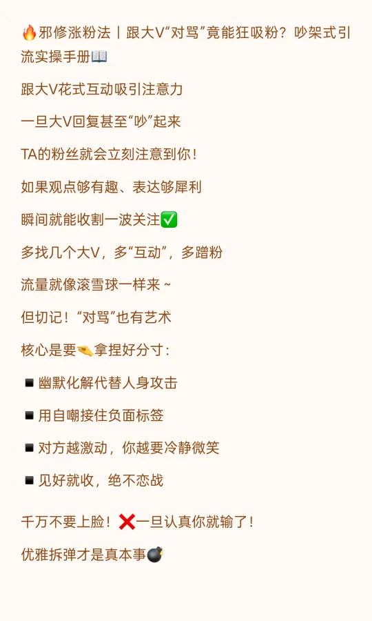 邪修涨粉法:通过跟大v对骂来吸引注意力,一旦大v回复并吵起来,大v的粉丝会马上注意到如果观点有趣就会涨粉。多找几个大v,多对骂,多蹭粉。切记对骂也有对骂的艺术,千万不要上脸。