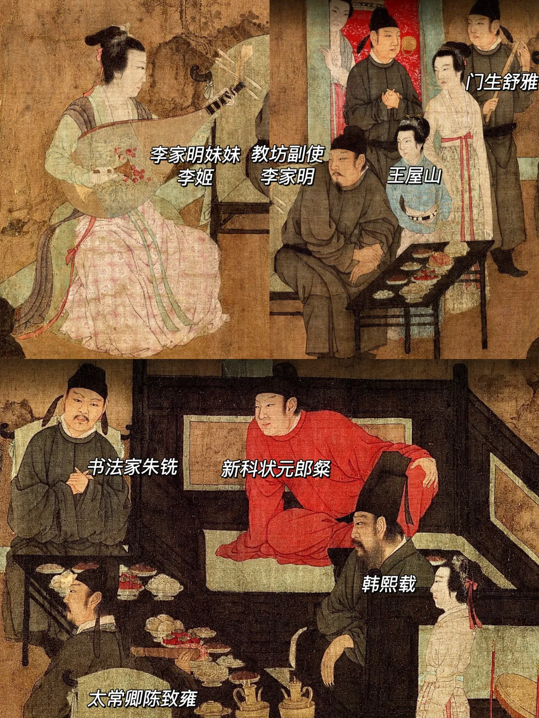 据《宣和画谱》记载,榻上红衣男子为新科状元郎粲,头戴高帽的是主人公韩熙载。此外,在场还有太常卿陈致雍、门生舒雅、书法家朱铣、教坊副使李家明,韩熙载家伎王屋山等人。
