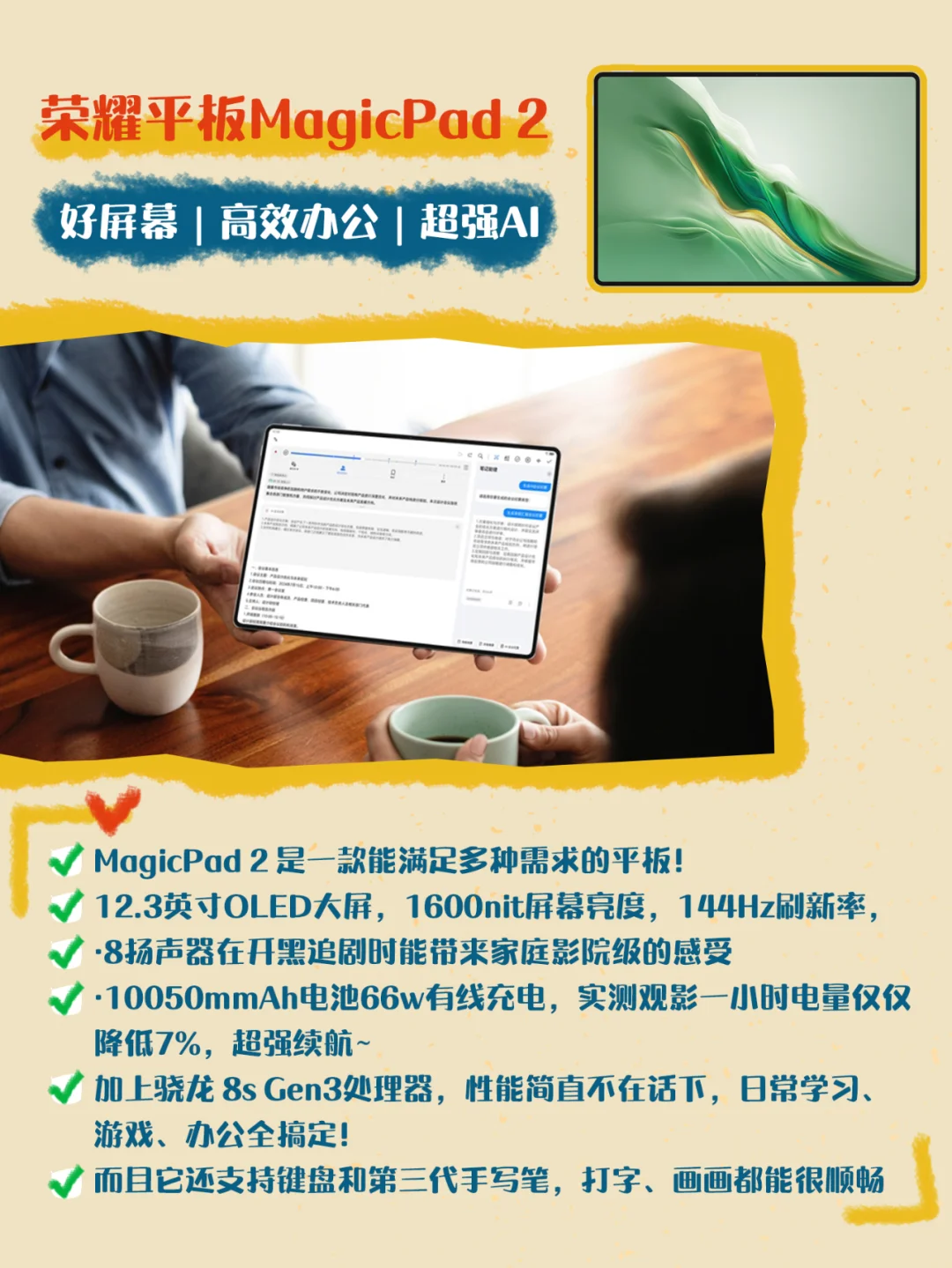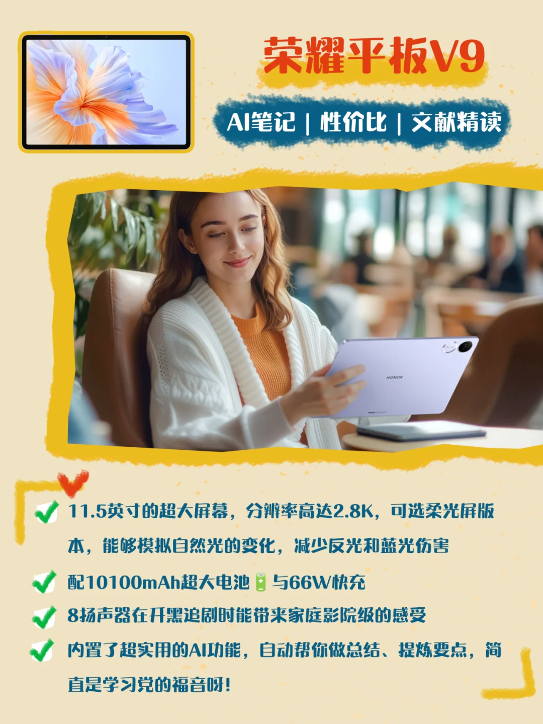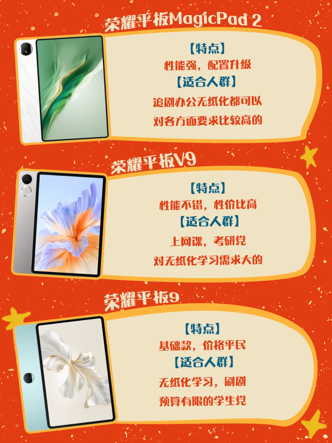 ⏰ 新的一年,准备好给自己或亲友挑选一款超实用的数码好物了吗? ⭐今天,小天专门为大家整理了荣耀平板和荣耀手表的挑选攻略! ⭐无论你是学生党、上班族,还是游戏迷、健康控, ⭐看完这篇,你就能轻松挑选出最适合自己的那一款产品! 1️⃣荣耀平板 MagicPad 2 ⭐ 适合人群:考研党、上班族、娱乐党、学生党 ⭐MagicPad 2不光性能超强,屏幕大得让你爽到飞起,尤其适合学习、工作、娱乐多重需求的宝子们! ⭐骁龙 8s Gen3处理器,性能杠杠的,想玩游戏、上网课,完全不成问题! 2️⃣ 荣耀平板GT Pro ⭐适合人群:游戏党、性能党 ⭐超快的处理速度和超凡的散热系统,游戏体验那叫一个流畅!✨ ⭐别担心掉帧,打得爽快,手感也超好! ⭐不支持键盘,但手写笔也能给你带来超棒的创作体验✍️。 3️⃣ 荣耀平板V9 ⭐ 适合人群:重度学习党、爱看剧的小伙伴 ⭐V9适合那些学习、娱乐两手抓的朋友! ⭐10100mAh超大电池和66W快充,电量不怕没电, ⭐随时随地看剧、刷网课,完全没问题! ⭐而且还配备AI智能总结功能,做笔记、整理资料轻松搞定!✨ 4️⃣ 荣耀平板 9 ⭐ 适合人群:追剧、看网课、轻度学习党 ⭐如果你只是用来追剧、看网课或简单学习,闭眼入这款 ⭐12.1英寸的屏幕,2.5K的画质,追剧的时候超级爽! ⭐价格也亲民,预算有限的朋友绝对值! 5️⃣ 荣耀手表 4 Pro ⭐适合人群:健康党、运动爱好者 ⭐作为荣耀手表的旗舰款,4 Pro真的是从配置到体验都超级给力! ⭐ 支持eSIM,打电话不带手机也能轻松沟通, ⭐而且健康监测一应俱全,运动追踪功能也很全! 6️⃣荣耀手表 5 ⭐ 适合人群:长辈、户外运动爱好者、健身人士 ⛷️ 它内置荣耀北极星定位系统,跑步轨迹更精准! ⛰️ 还有丰富的运动模式,AI减脂助手、体检功能, ⭐最适合长辈或者爱运动的小伙伴啦! 7️⃣ 荣耀亲选 WhizKid儿童手表2 Pro ⭐适合人群:家有小宝的家庭 ⭐1.52英寸的屏幕超大超清晰,孩子操作起来简单方便。 ⭐如果孩子遇到紧急情况,还能一键SOS,还是孩子的小运动教练 ⭐最后总结,选购数码产品时,最重要的是根据自己的需求和预算来决定~ ⭐记得留言告诉我,你最心仪的是哪一款呢? 荣耀平板v9  一起聊数码   新年荣耀   荣耀平板   数码好物分享   荣耀手表   平板选购