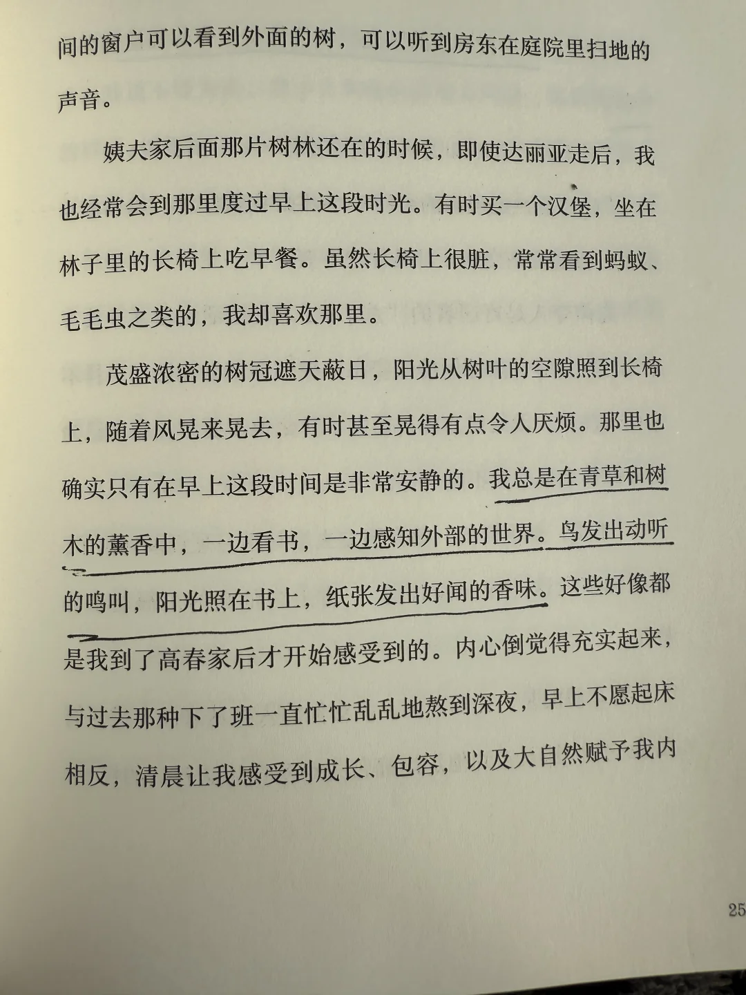 想到之前在书里本里看到,“在村子里的木屋住上半个月,每日散步,阅读,在林中空地的长椅写作,在树影光斑间聆听喜鹊唱歌,在一个睡觉时安静得能听见虫子叫的地方生活,甜美的空气和潺潺的溪流钝化了我的棱角,我对世界没那么愤怒了。…”