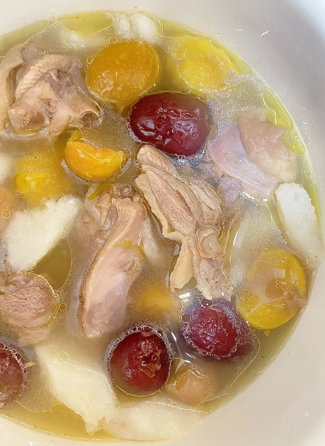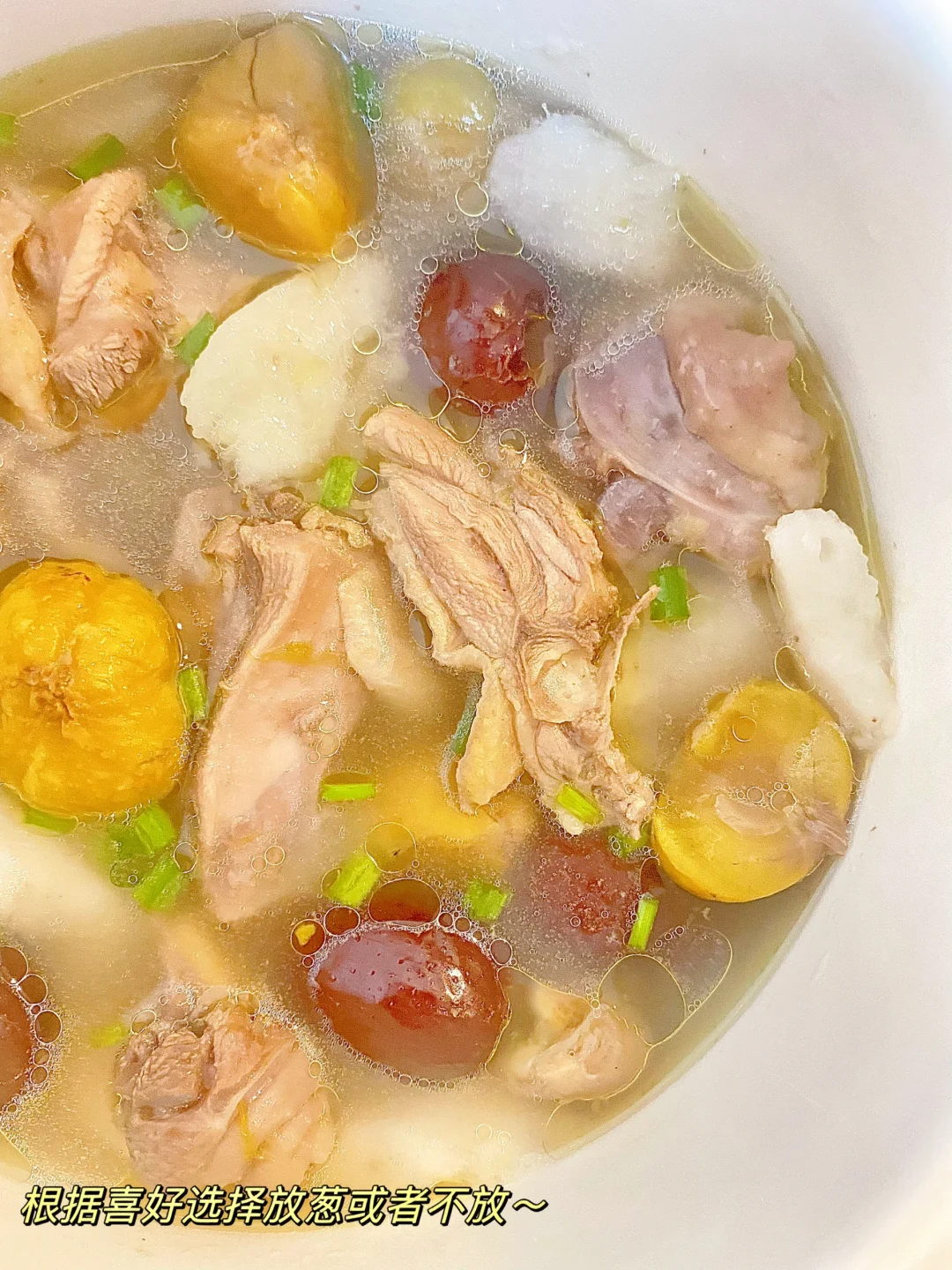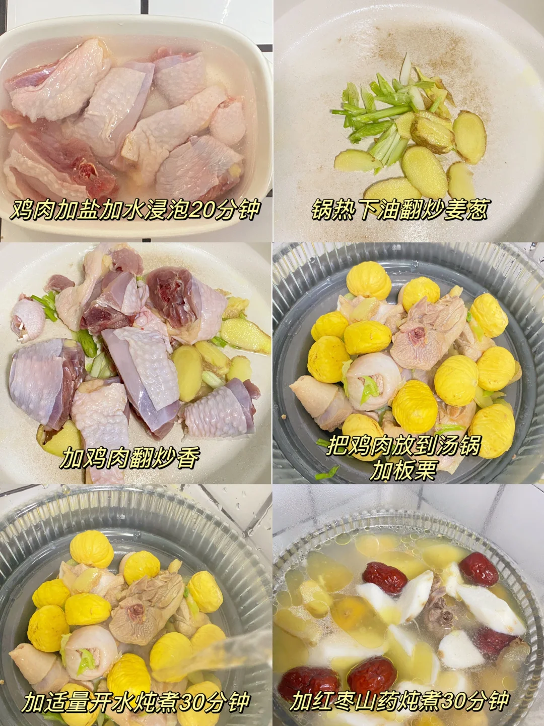 板栗也太太太好吃啦! 软软糯糯!还健脾养胃! 下班炖一锅直接当晚饭,低脂简单又美味 真是太幸福啦[哇R][哇R][哇R] ✅材料 鸡肉150g(一人份),板栗6-8颗,红枣6颗 ✅步骤 1️⃣鸡肉加清水和盐浸泡20分钟,泡出血水洗净备用 2️⃣下油爆香姜葱,加入鸡肉翻炒一会 3️⃣加入板栗和适量开水,炖煮30分钟 4️⃣下红枣山药,再炖30分钟 5️⃣最后加盐调味就可以出锅啦 喜欢吃有嚼劲一些的鸡肉就买散养老母鸡,鸡皮都是QQ弹弹的[偷笑R][偷笑R][偷笑R]