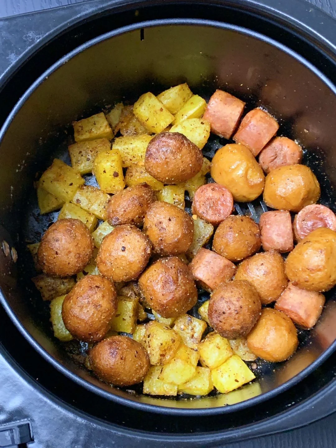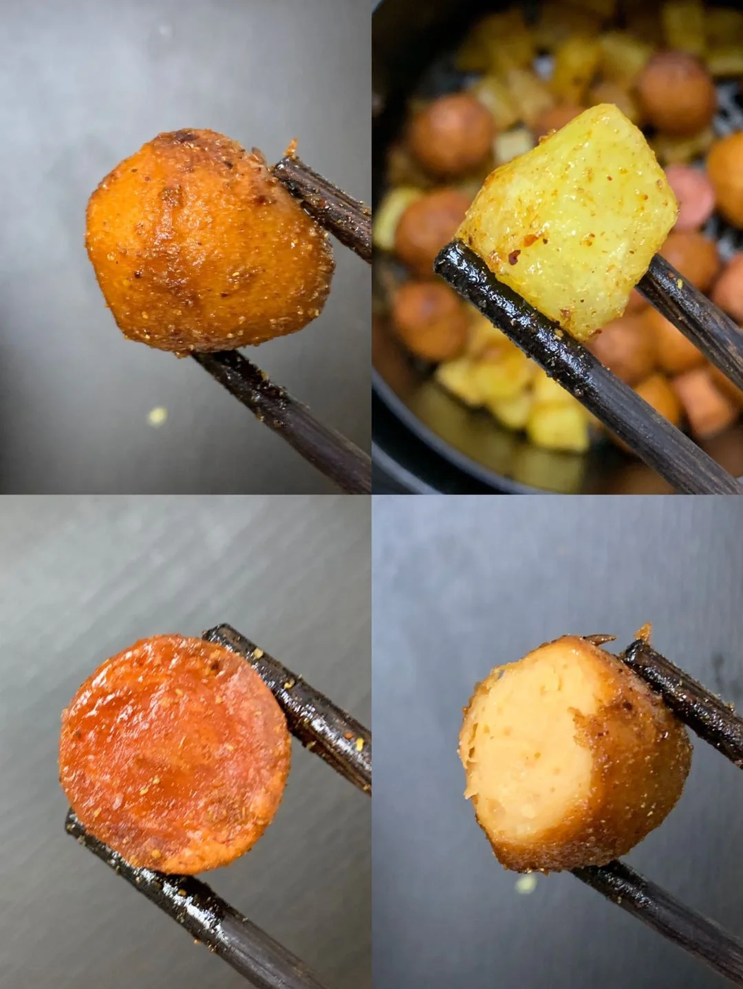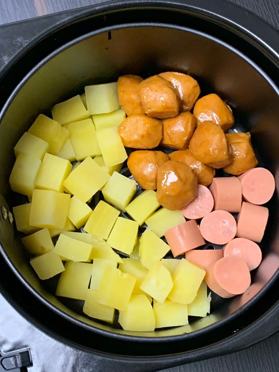 3、火腿切块儿!和土豆!咖喱鱼蛋!一起放入空气炸锅内!撒孜然粉!辣椒面!180度10分钟!