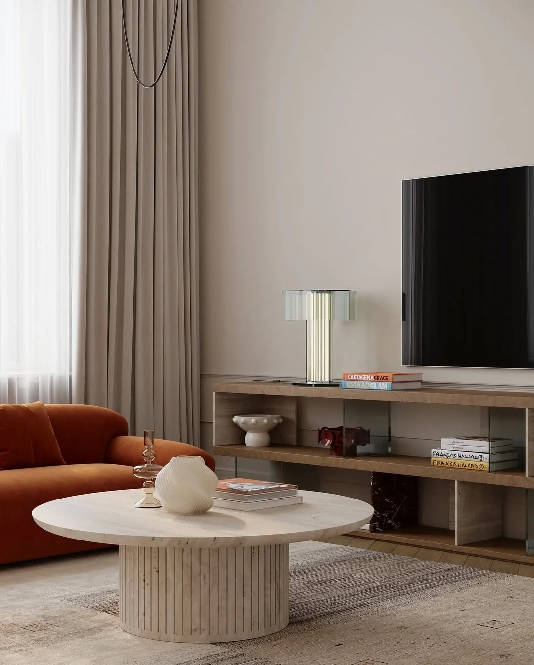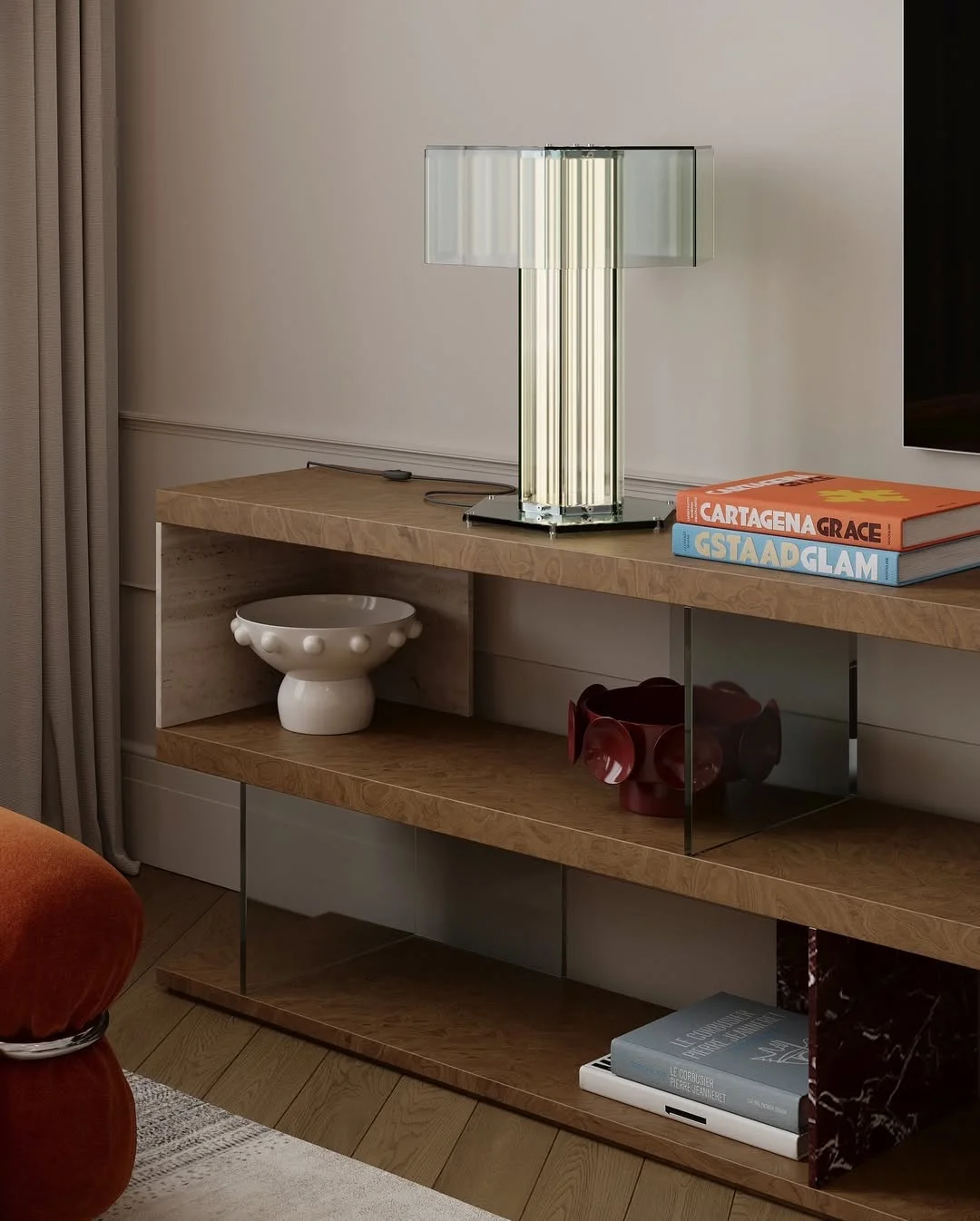 这是一个关于材质与光的对话:木的温度、石的力量、玻璃的通透,再加上 FLOS 的灯光点亮,厚与轻、久与动都在这里找到平衡。