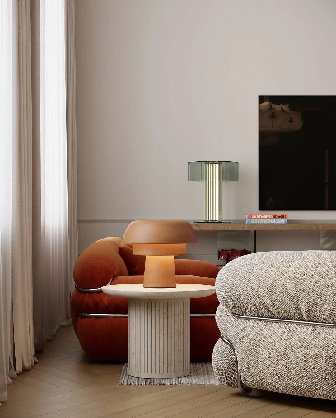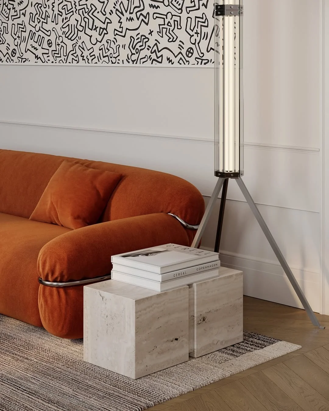 细节里藏着惊喜:FLOS 的 Superwire Table 台灯安静地守在一侧,像一件雕塑,和大理石呼应;头顶的 AIM 吊灯随意垂落,拉出一种轻盈的节奏;而 Superwire Floor 落地灯则用流畅的线条,把光变得温柔。