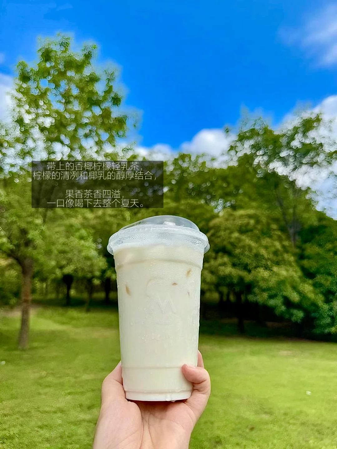 带上的香椰柠檬轻乳茶,柠檬的清冽和椰乳的醇厚结合,果香茶香四溢,一口喝下去整个夏天。