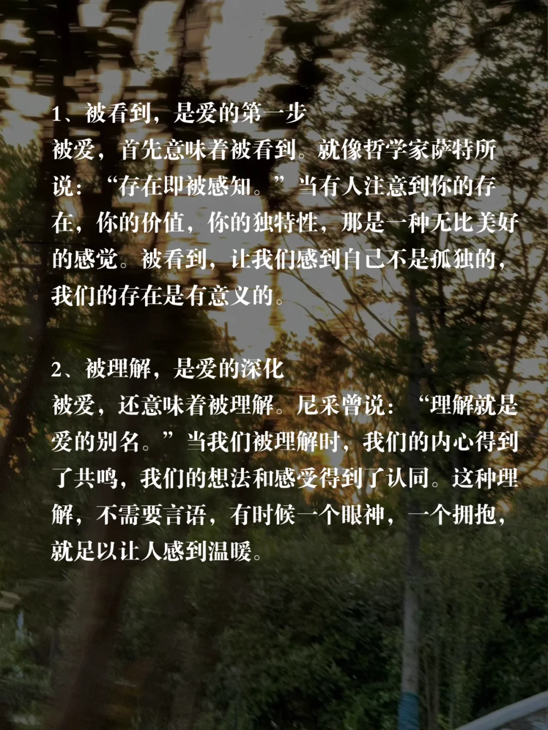 被爱,还意味着被理解。尼采曾说:“理解就是爱的别名。”当我们被理解时,我们的内心得到了共鸣,我们的想法和感受得到了认同。这种理解,不需要言语,有时候一个眼神,一个拥抱,就足以让人感到温暖。