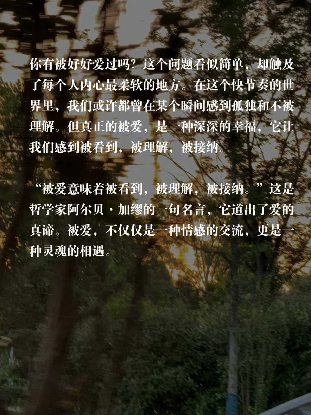 “被爱意味着被看到,被理解,被接纳。”这是哲学家阿尔贝·加缪的一句名言,它道出了爱的真谛。被爱,不仅仅是一种情感的交流,更是一种灵魂的相遇。