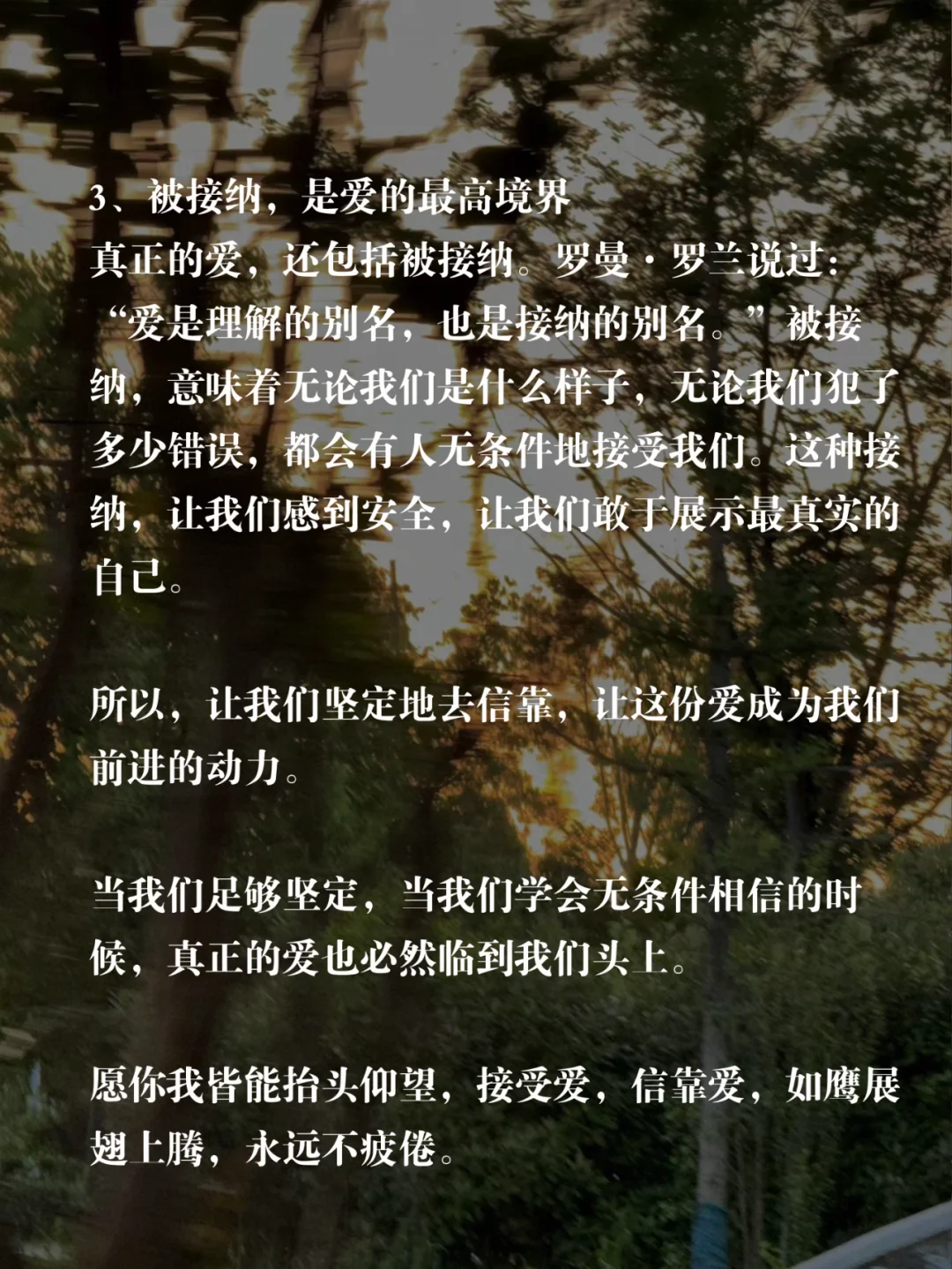 真正的爱,还包括被接纳。罗曼·罗兰说过:“爱是理解的别名,也是接纳的别名。”被接纳,意味着无论我们是什么样子,无论我们犯了多少错误,都会有人无条件地接受我们。这种接纳,让我们感到安全,让我们敢于展示最真实的自己。