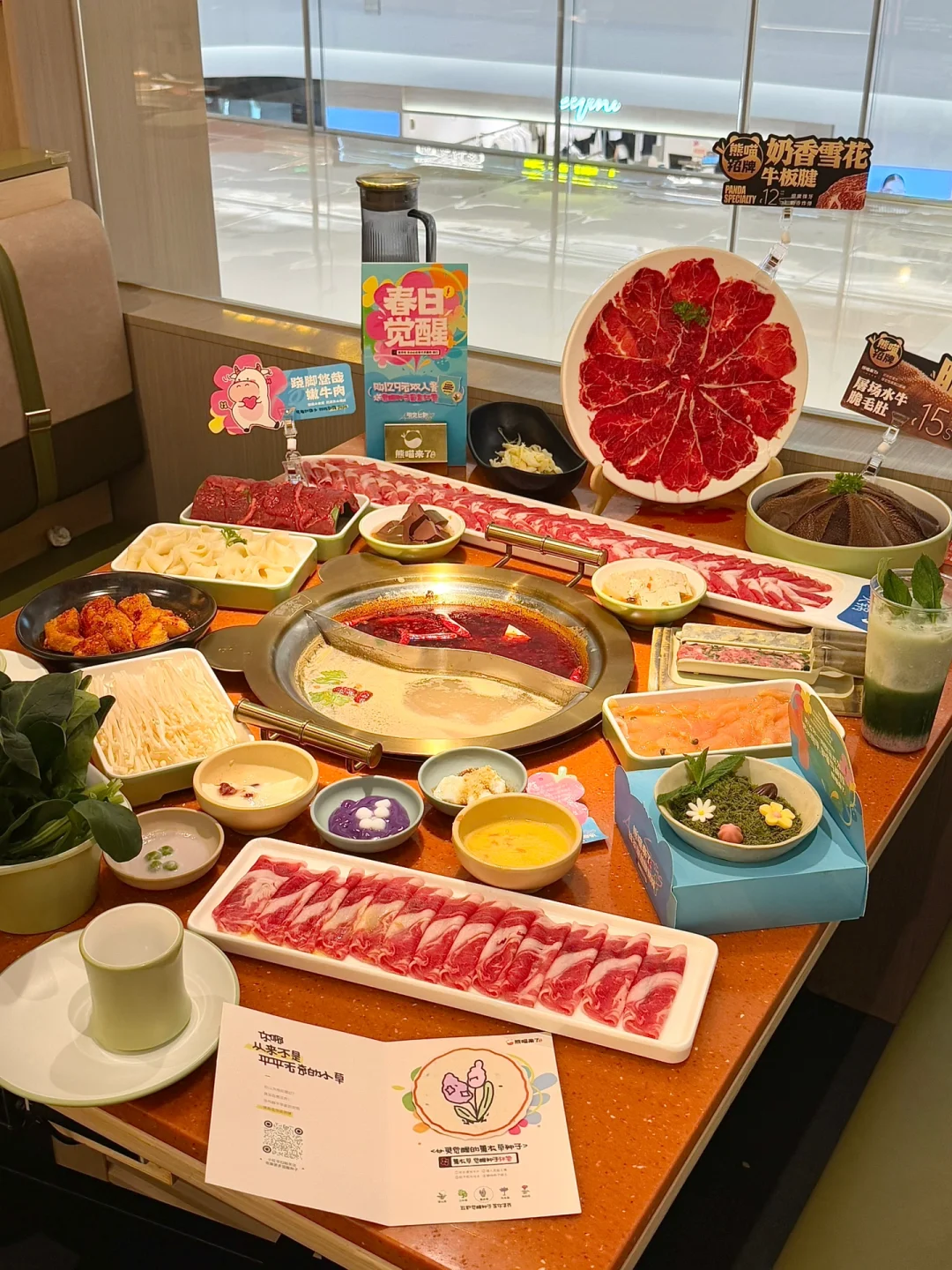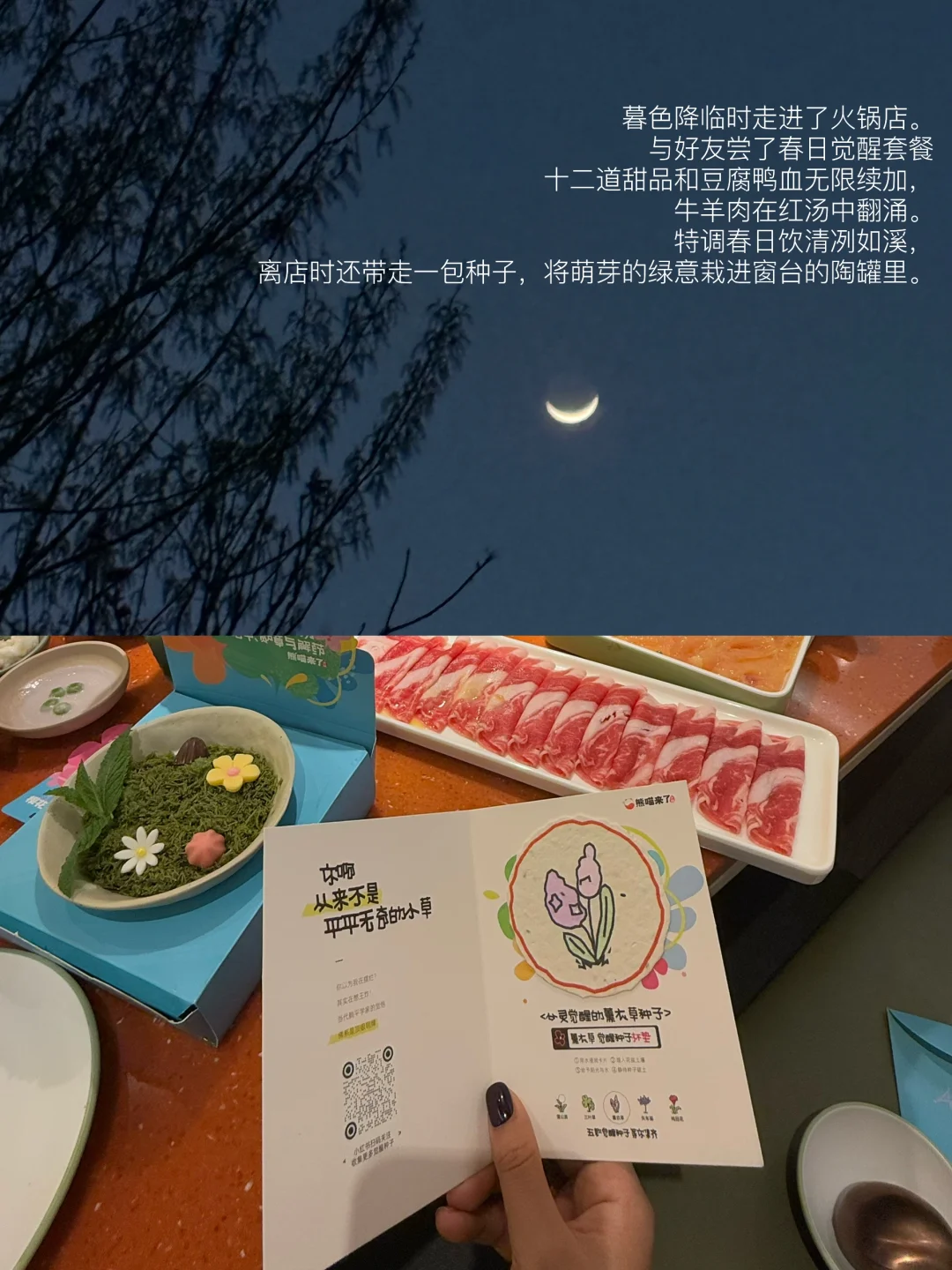暮色降临时走进了火锅店。与好友尝了春日觉醒套餐——十二道甜品无限续加,豆腐与鸭血在红汤中翻涌。特调春日饮清冽如溪,离店时还带走一包种子,将萌芽的绿意栽进窗台的陶罐里。