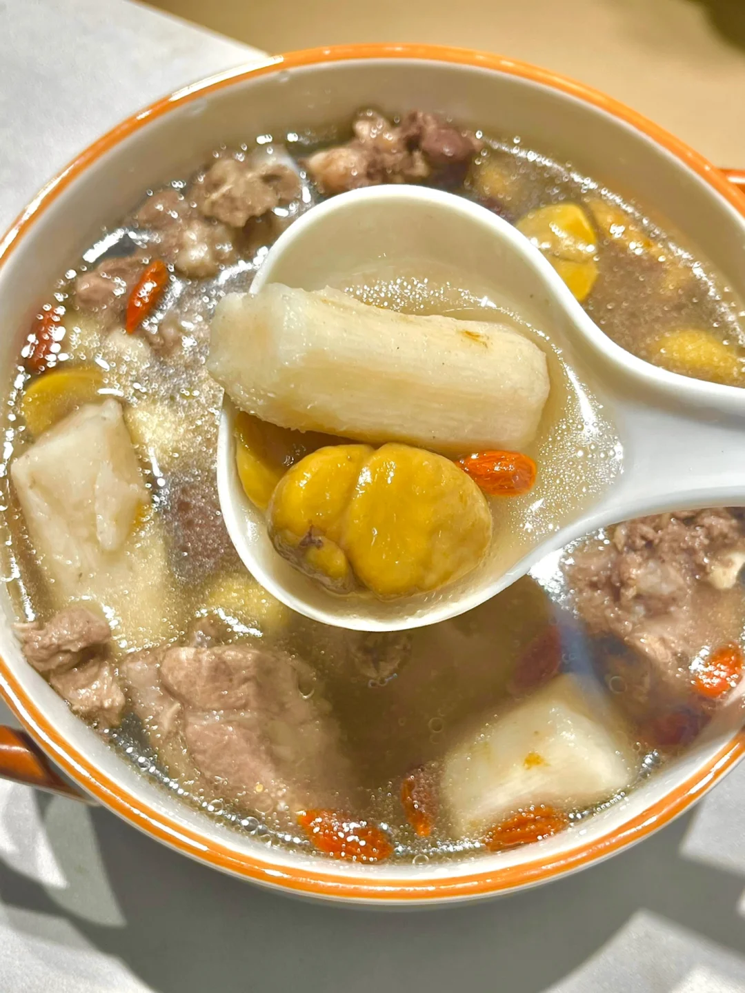 冬季要进补,进补得先养好脾胃!脾胃好自然吸收好![派对R]板栗,秋季的果实,有“干果之王”的美称,丰富的维生素C比苹果等一些常见水果还要高出3-5倍以上[点赞R]栗子很粉,因为含大量淀粉,还有蛋白质,是秋天用来健脾胃的当季食材[鼓掌R]煲汤用的山药,用铁棍山药最好[赞R]口感粉嫩细腻,氨基酸含量也更多更丰富,煲汤首选。配上板栗的香味,汤很清香,超级好喝[点赞R]
