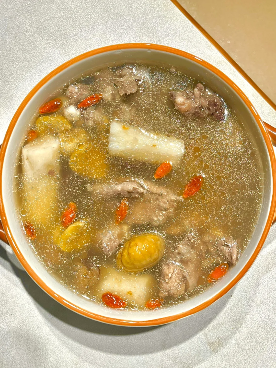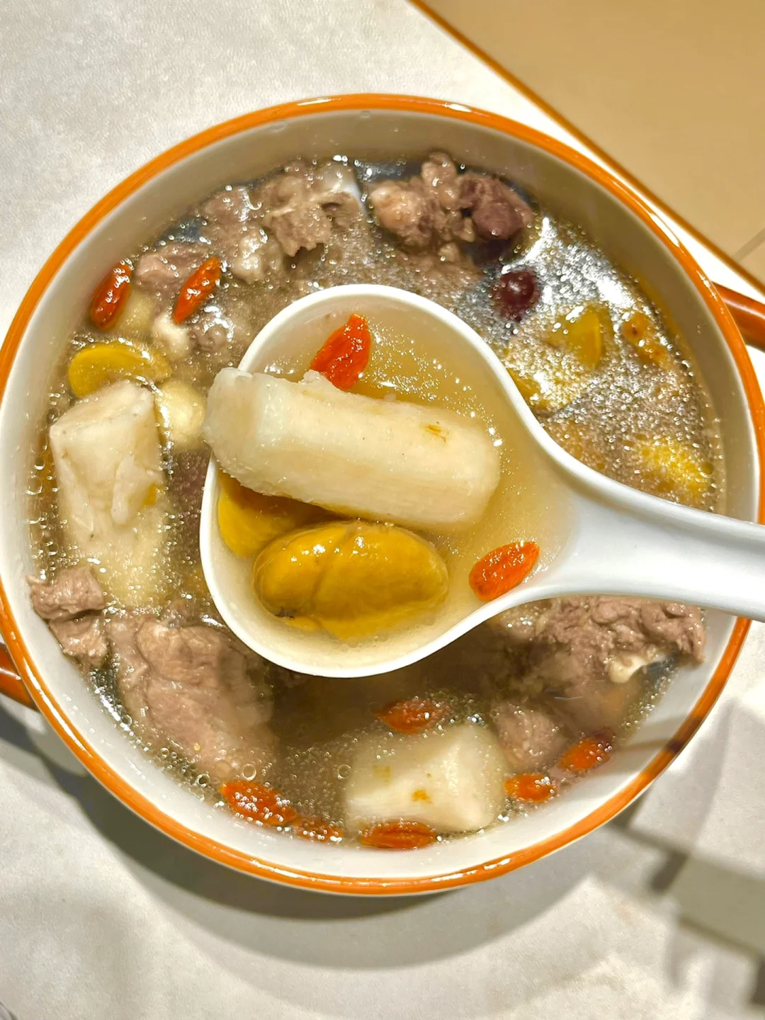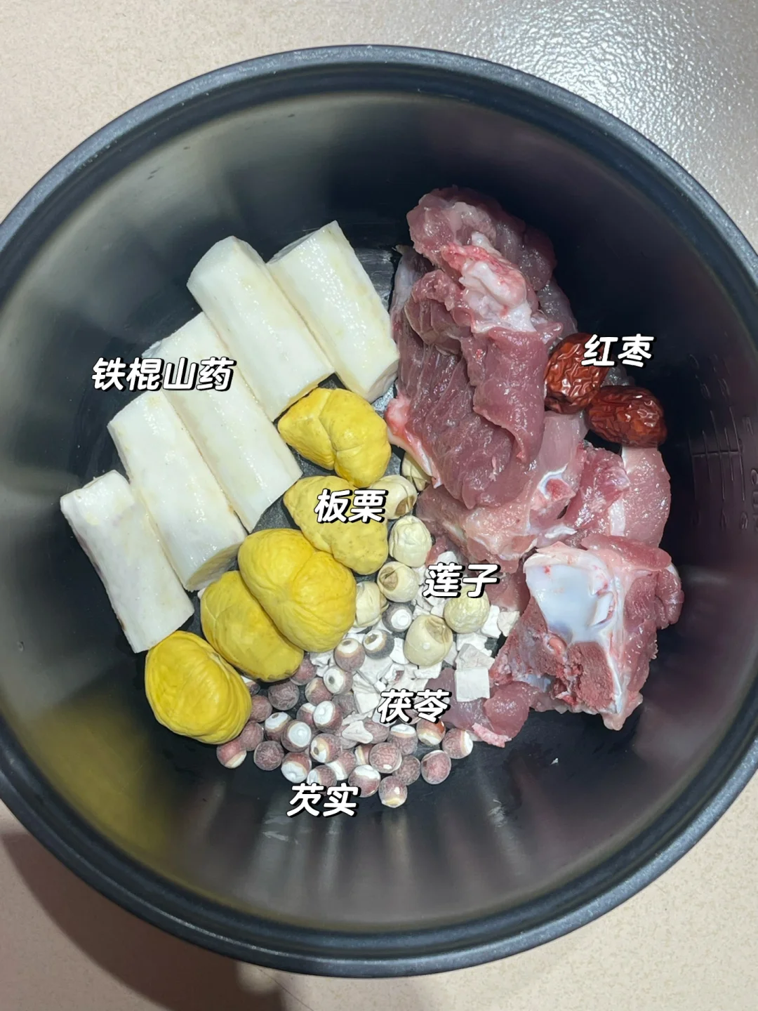 🉐做法:猪骨焯水洗干净,与山药,板栗,莲子,芡实,茯苓,红枣一起炖1.5小时,最后撒上枸杞闷10分钟,出锅加盐调味即可