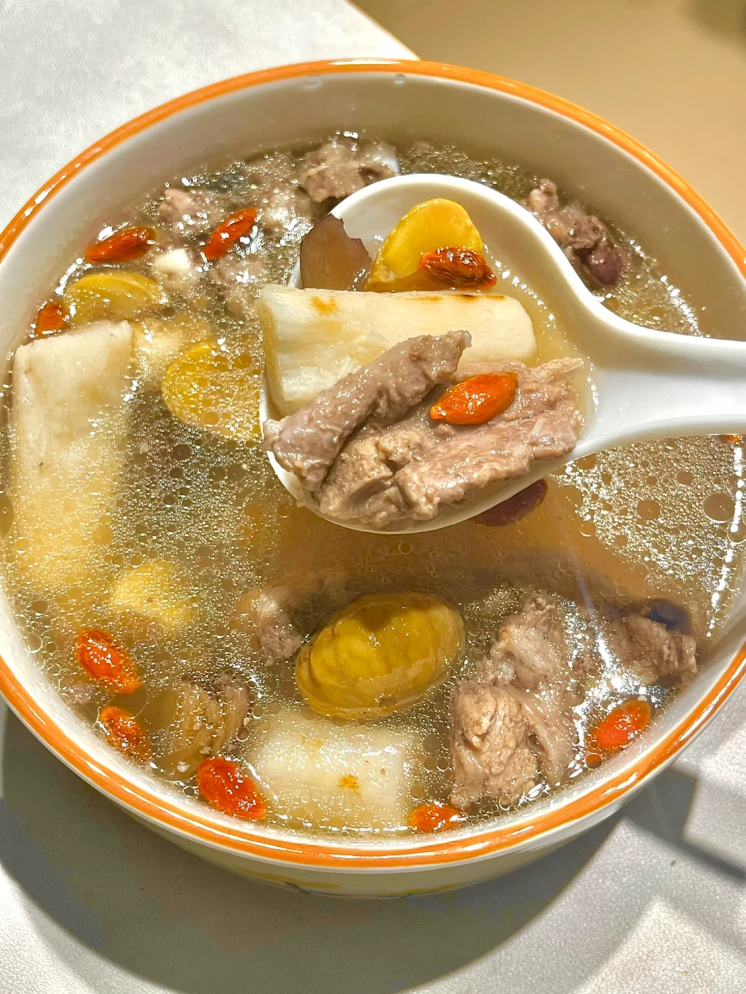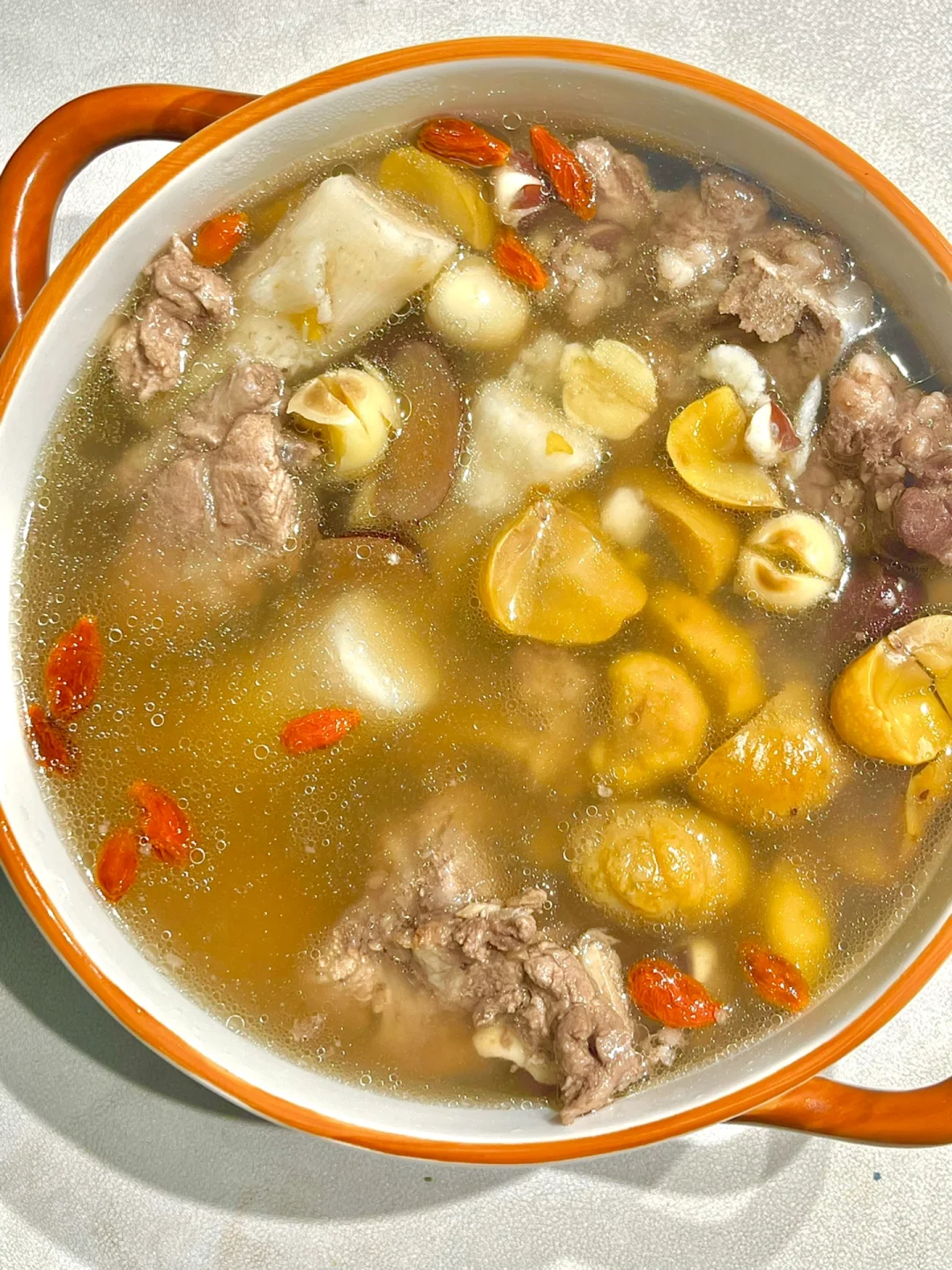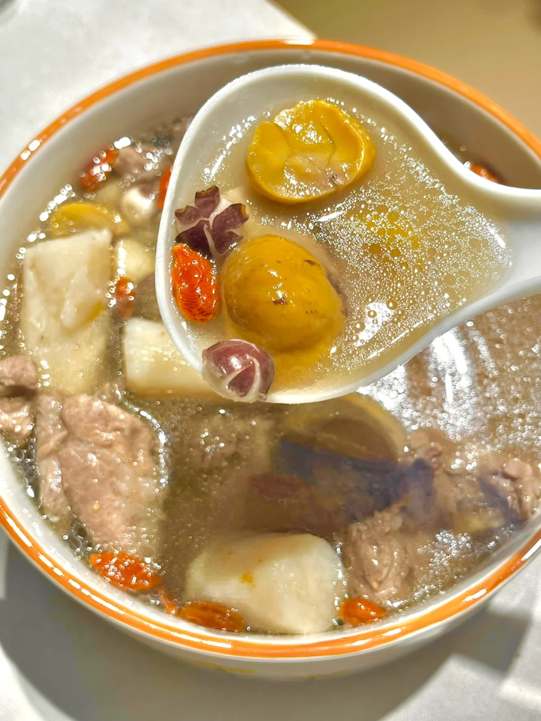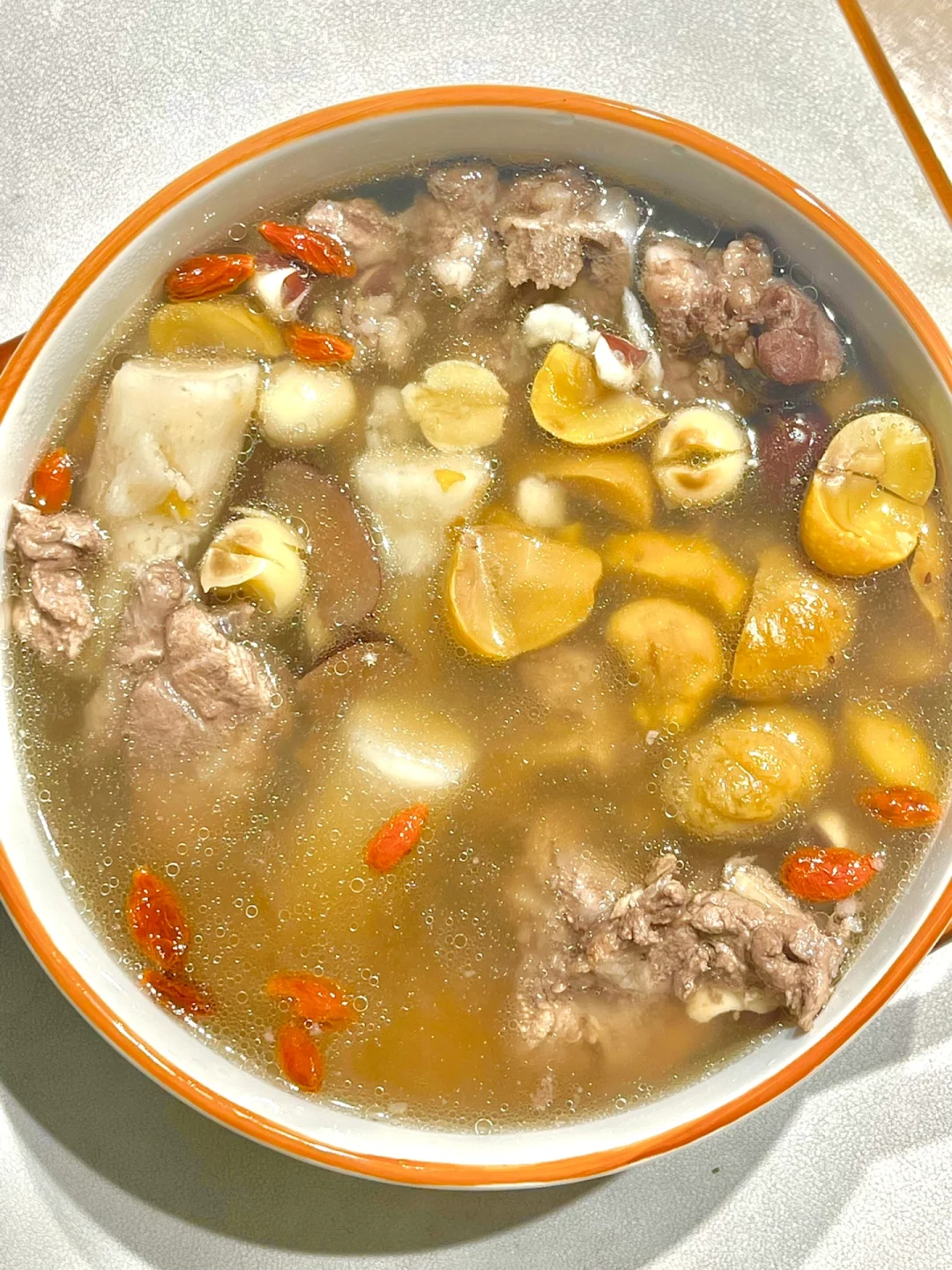 🉐做法:猪骨焯水洗干净,与山药,板栗,莲子,芡实,茯苓,红枣一起炖1.5小时,最后撒上枸杞闷10分钟,出锅加盐调味即可