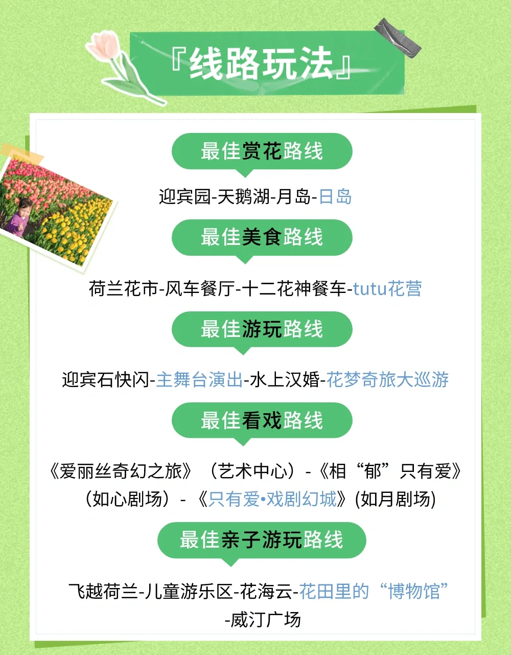 飞越荷兰(景区外面)→天鹅湖→可秀园→花海云→情侣园→花海里的博物馆→月岛→日岛→《只有爱·戏剧幻城》→圣劳伦斯文化中心