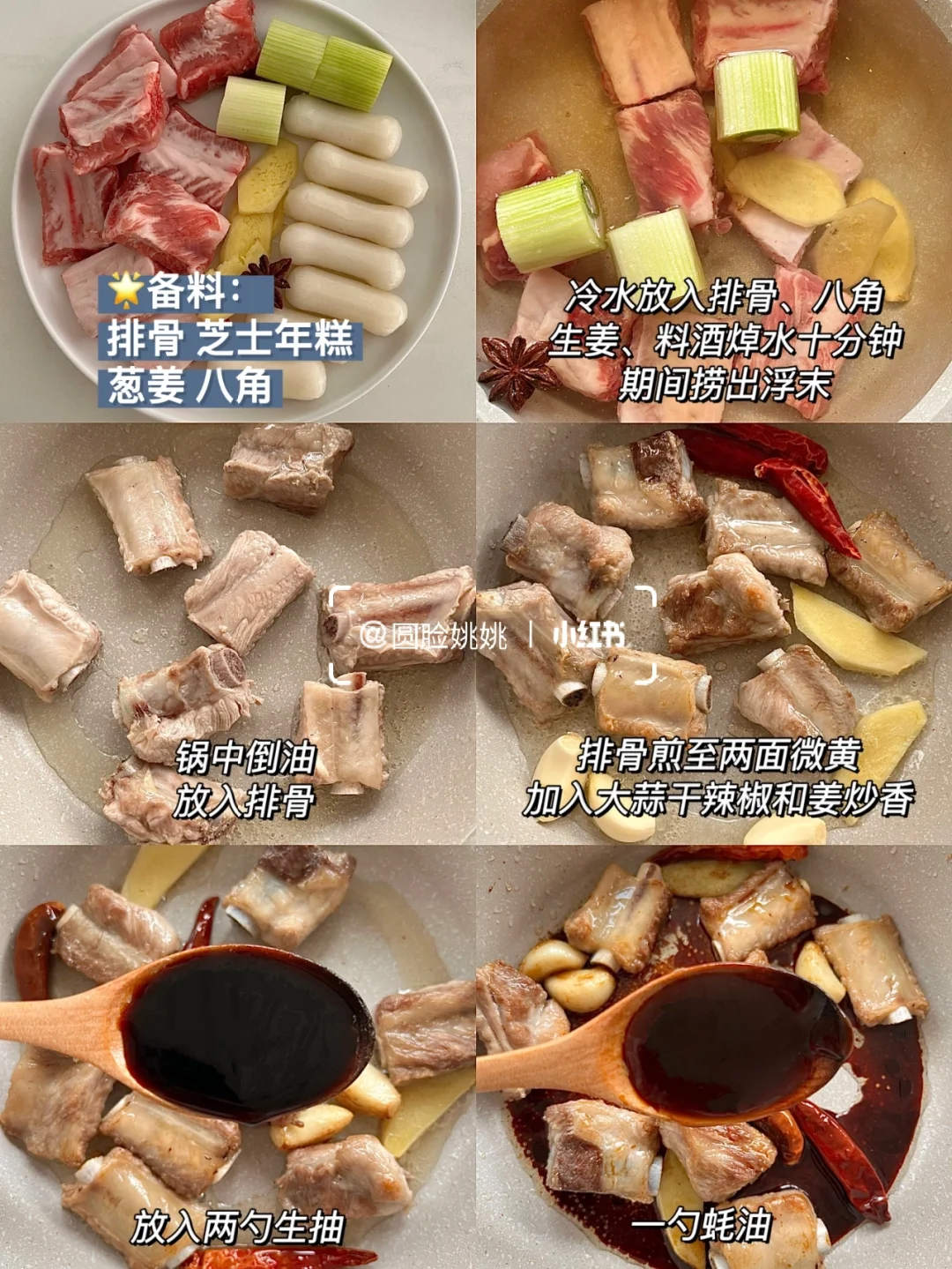 1⃣️排骨冷水下锅放入排骨、八角、生姜、料酒焯水十分钟,期间捞出浮末