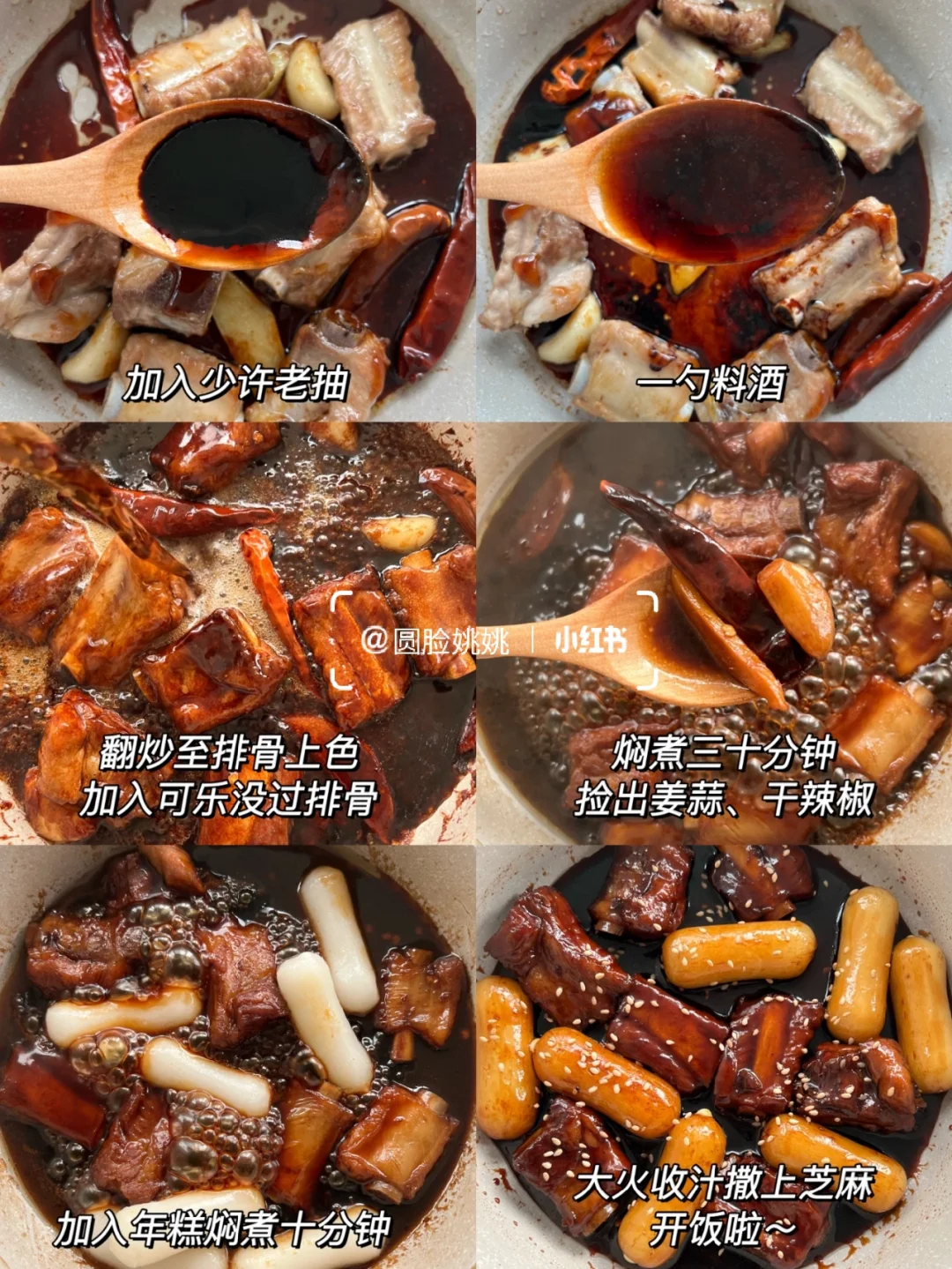 3⃣️放入两勺生抽、一勺蚝油、少许老抽、一勺料酒翻炒至排骨上色,倒入可乐没过食材,捡出小料焖煮30分钟后,放入年糕焖煮10分钟,大火收汁撒上芝麻即可~