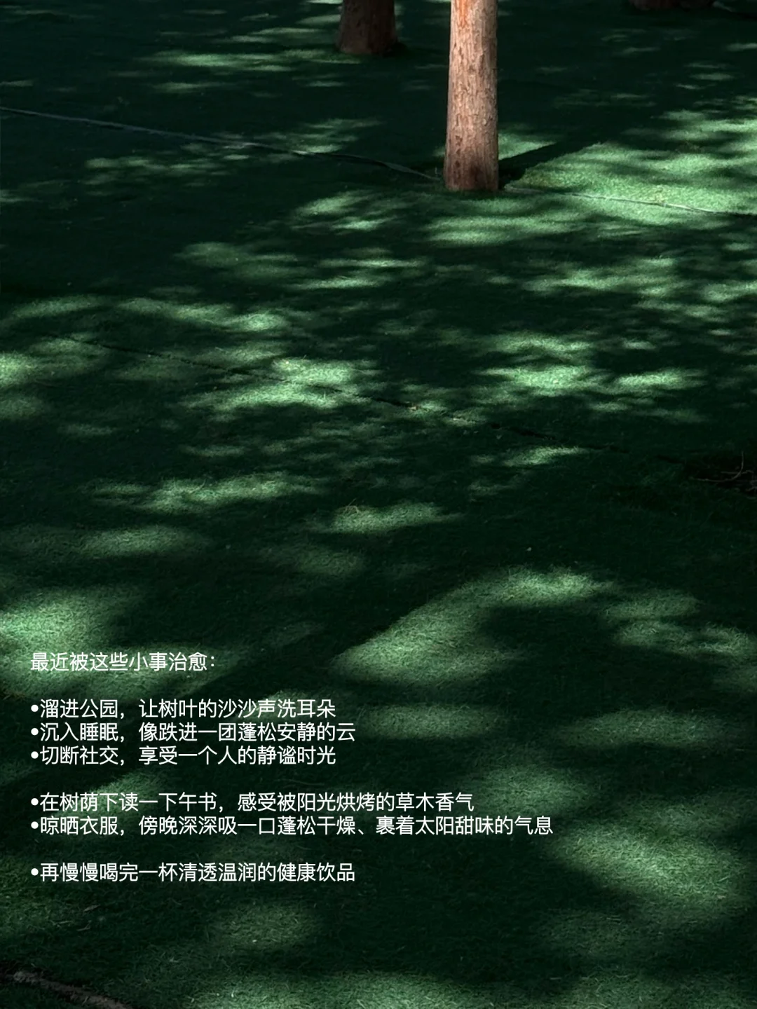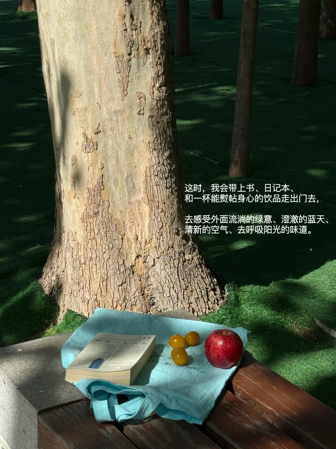 这时,我会带上书、日记本、和一杯能熨帖身心的饮品走出门去,去感受外面流淌的绿意、澄澈的蓝天、清新的空气、去呼吸阳光的味道。