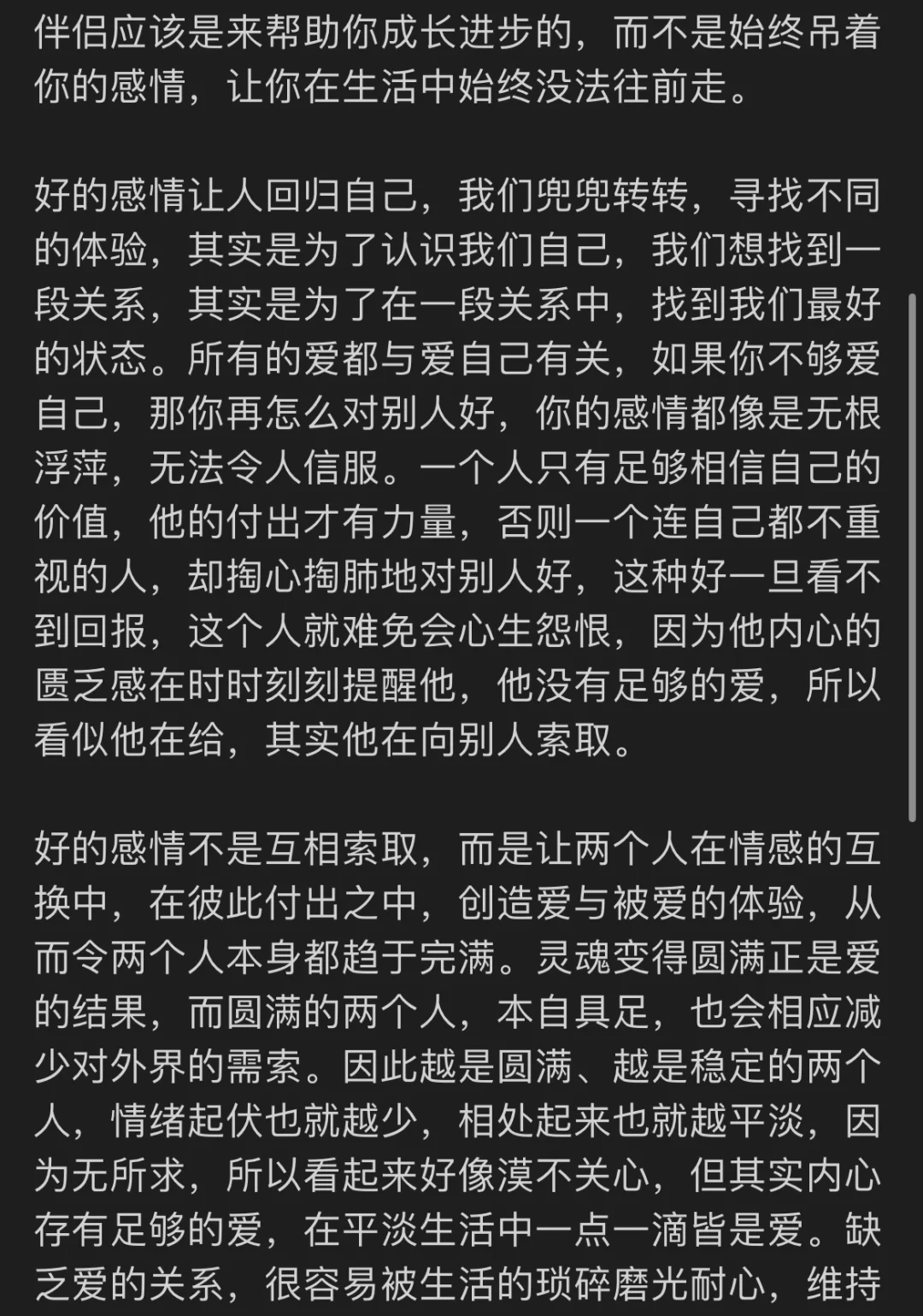 好的感情让人回归自己,我们兜兜转转,寻找不同的体验,其实是为了认识我们自己,我们想找到一段关系,其实是为了在一段关系中,找到我们最好的状态。好的感情不是互相索取,而是让两个人在情感的互换中,在彼此付出之中,创造爱与被爱的体验,从而令两个人本身都趋于完满。灵魂变得圆满正是爱的结果,而圆满的两个人,本自具足,也会相应减少对外界的需索。